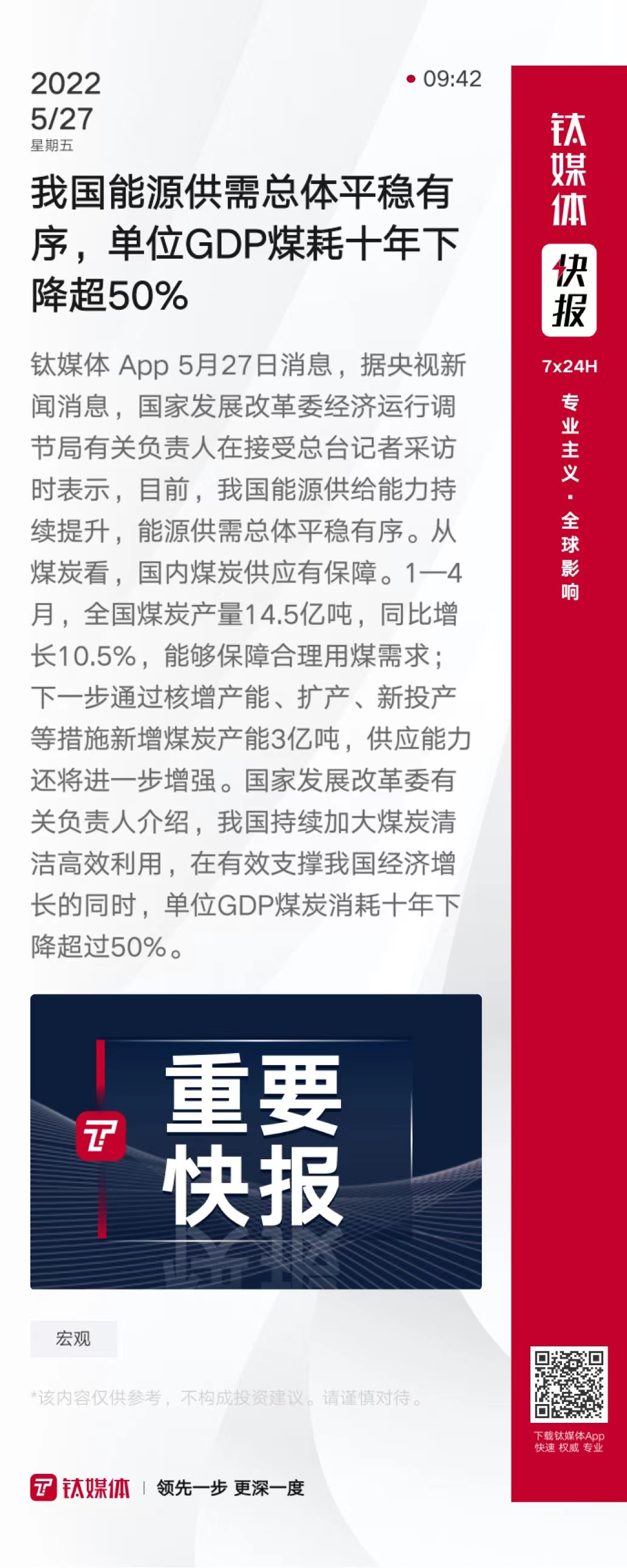 我国能源供需总体平稳有序,单位GDP煤耗十年下降超50%