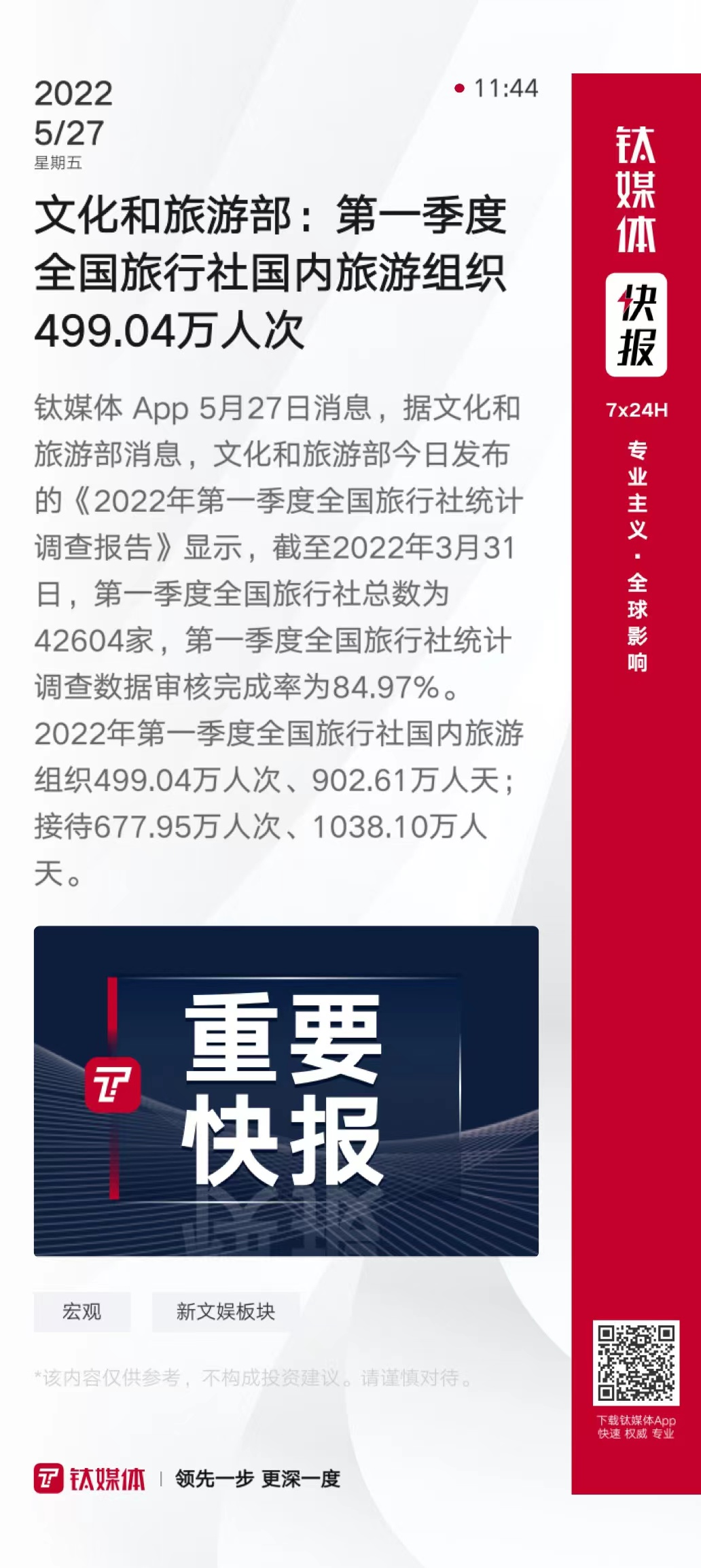 文化和旅游部:第一季度全国旅行社国内旅游组织499.04万人次