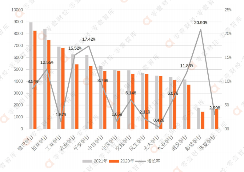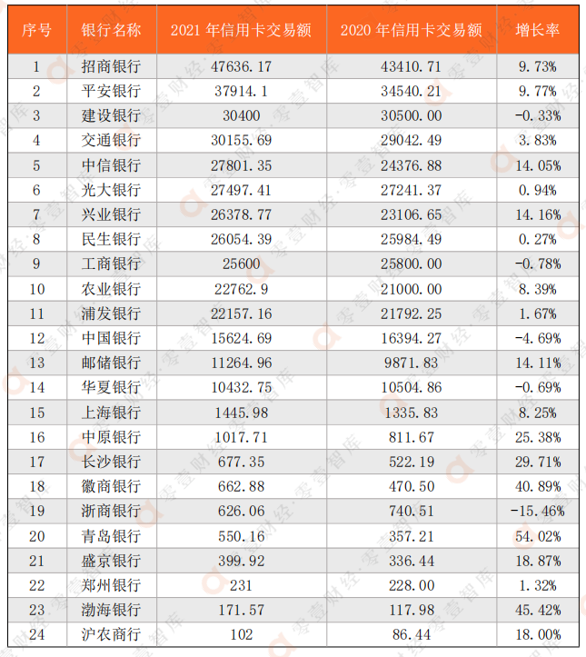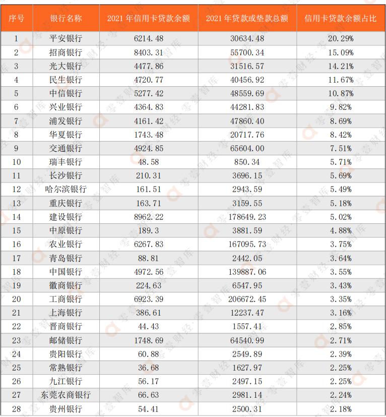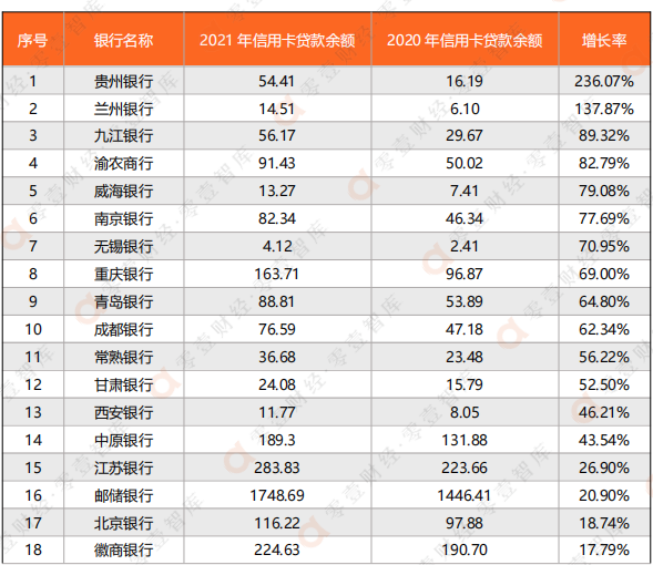累计发卡规模上,整体阶梯效应明显。工商银行、建设银行、中国银行、招商银行和中信银行占据着第一梯队,累计发行量均超过了1亿张,其中工商银行凭借1.63亿张排在首位。第二梯队则是光大银行、交通银行、平安银行、民生银行等,累计发行量达到了千万级别,前两梯队主要为国由大行和股份制银行占据,值得注意的是上海银行是唯一一家累计发卡量达到千万张的城商行。而第三梯队主要为城商行和农商行,规模相对较小,其中最高的江苏银行累计发卡量为510万张。零壹智库的统计显示,在上述41家披露2021年信用卡累计发行量的银行中,有4家银行未在2020年披露这一数据(沪农商行、晋商银行、厦门银行和东莞农商银行),对比其余37家银行的增长数据,具体情况如下表:2、招商银行、交通银行、浦发银行、邮储银行的增长率是基于“信用卡流通量/在册卡量/结存卡量”等口径计算出,具有一定的误差。从信用卡累计发卡量的增速看,城商行优势更大,以增长率进行排序前20名有16家为城商行,其中南京银行的累计发卡以近一倍增长率登顶。增长率达到50%以上的分别有南京银行、甘肃银行和渤海银行,其中渤海银行是增长最快的股份制银行,其余的股份制银行普遍低于20%。从增长量的角度看,中信银行2021年以870万张的新增卡量成为2021年的信用卡“发卡之王”,同时信用卡规模也首次超过一亿,除中信银行外招商银行也凭借着288.44万的新增发卡量跻身于亿级规模。图2 累计增长量前14名其增长率数据(单位:万张)另一方面,若对市场上存量较高的信用卡(信用卡累计发卡量达到千万张,即前14名)进行其增长情况的对比,可以看出信用卡的存量和增量存在着一定的负相关,其中华夏银行、上海银行、邮储银行和浦发银行2021年增长较快,增速均超过了10%,另外,中信银行和平安银行也分别达到了9.4%和9.15%。二、信用卡贷款余额:阶梯效应明显,平安银行高度重视信用卡银行的信用卡业务,除了累计发卡量这一关键指标,信用卡的贷款余额情况能进一步反映各银行的信用卡的业务规模和使用情况,也是衡量信用卡业务的重要指标。在59家银行中共有50家披露了信用卡贷款余额的情况,披露口径相对标准,披露比例也较高,具体的数据是排名如下:1、文中将图表分拆为两部分,主要考虑到层级相差较大,若在同一图表排序则无法对排名偏后的银行做直观对比。2、各银行披露口径有所不同,除了“信用卡贷款余额”之外,还有“信用卡透支余额”,“信用卡资产余额”,“信用卡应收账款余额”等口径,为直观比较故作为同一维度进行对比,具体排名可能存在误差。4、文中信用卡贷款余额大部分为本行数据,部分银行未披露本行数据则使用集团数据,具体排名可能存在一定误差。与信用卡累计发卡量这一指标类似,贷款余额也存在着一定的阶梯,国有大行和多数股份制银行均达到了千亿的信用卡贷款余额。与累计发卡量排名不同的是,建设银行以8962.22亿元的贷款余额位列首位,招商银行以8403.31亿元排在次位。在城商行和农商行方面,贷款余额的规模相较于头部则呈现大幅缩减,最高的上海银行信用卡贷款余额为386.61亿元,体量上仅有华夏银行四分之一左右,信用卡贷款余额最高的农商行沪农商行则为110.65亿元,最低的不足1亿元,与头部银行全国范围的激烈竞争不同,城商行和农商行注重于区域内信用卡业务的发展。对近两年50家银行信用卡贷款余额数据进行相关统计显示,仅有江阴银行和锦州银行未披露2020年信用卡贷款余额的数据,最终呈现出48家银行的信用卡贷款余额增长情况:1、2021年数据与2020年数据为同一统计口径。2021年,信用卡贷款余额增长率超过100%的有贵州银行和兰州银行,其中贵州银行较2020年增长了2.4倍,值得注意的是其2020年增长率同样高达374%,足以看出贵州银行正实现信用卡产品的高速发展。对比大行,城商行和农商行继续保持着快速增长的趋势,股份制银行和国有大行之中增速最大的为邮储银行,增长率达到了20.9%,主要是由于邮储银行于2021年大力提升信用卡产品的创新能力,加强了商圈场景建设和品牌营销力度。不同于大部分银行的正向增长趋势,有5家银行出现了零增长或负增长的现象,其中东莞农商银行以18.97%的负增长排在末位,沪农商行尽管在信用卡贷款余额规模上为农商行之最,但相较于2020年却出现了5.6%的负增长。同样对信用卡贷款余额规模较大的银行(信用卡贷款余额达到千亿元,即前14名)单独进行对比,与累计发卡量这一指标的样本不同的是上海银行则被剔除在外,而农业银行由于未披露累计发卡量但披露了信用卡贷款余额进入了对比样本内。14家银行全部为增长趋势,除了邮储银行达到20.9%的增长外,平安银行、农业银行、招商银行、浦发银行增长率均超过了10%。另一方面,对比2020年的贷款余额数据情况,邮储银行和中信银行凭借着较高的增长率分别在2021年信用卡贷款余额赶超了华夏银行和中国银行。信贷业务作为银行的重点业务,可细分为公司类贷款、个人贷款等多种产品类型,而信用卡信贷作为其中一环同样承担着银行信贷业务增长的使命。另一方面,通过统计信用卡贷款余额和银行总贷款余额的比例,也可充分反映各个银行信用卡业务的结构和价值,经统计的信用卡贷款余额占比具体数据如下:1、表格中各银行根据信用卡贷款余额占比进行降序排列