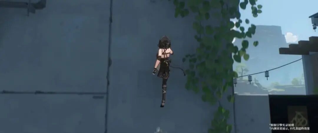 当我们把视角转到探索层面,可以看到《鸣潮》使用了如武侠小说中大侠们飞檐走壁的“蹬墙”动作替代了传统的攀爬动作,减少了玩家们探索时的难度,前往高处时也更有爽快感。