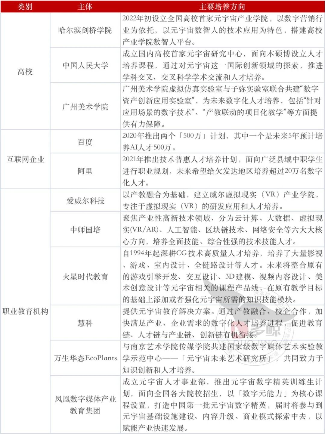 行业对当前数字化人才紧缺和未来元宇宙人才缺口表现出了高度的敏感性,各路玩家纷纷下场布局相关人才培训。目前,参与元宇宙数字化人才培养的主体主要有高校、互联网企业、职业教育机构三类。