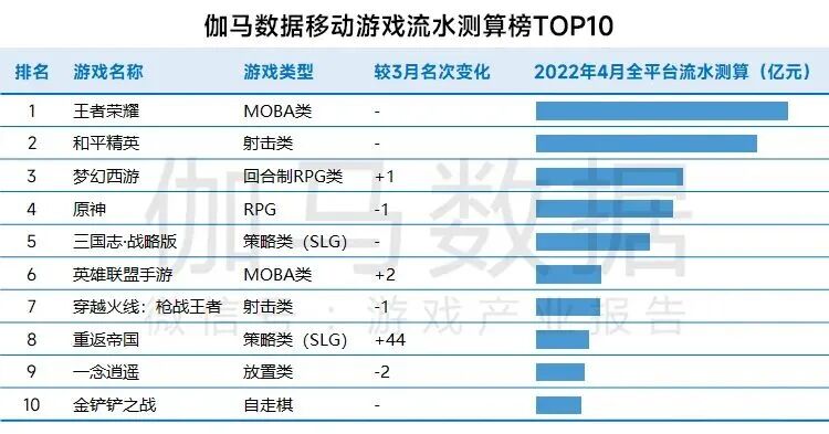 从报告内容来看也的确如此,并且显现出较强的马太效应。根据2022年4月全平台流水测算Top10显示,十款产品中仅有一款《重返帝国》为今年推出的产品,而其他的均为玩家们耳熟能详的头部产品,如《王者荣耀》《和平精英》《梦幻西游》《原神》《三国志·战略版》等。