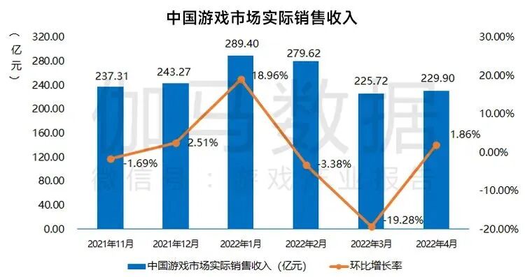 报告显示,2022年4月,中国游戏市场实机销售收入229.90亿元,环比增长1.86%,但同比下降3.40%。