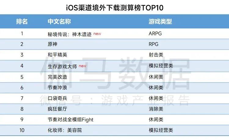 除此以外,在报告中还公布了4月iOS渠道海外下载测算榜Top10,十款产品分别为《秘境传说:神木遗迹》《原神》《和平精英》《生存游戏大师》《完美改造》《节奏冲浪》《口袋奇兵》《疯狂餐厅》《节奏对战全模组Fight》以及《化妆师:美容院》。