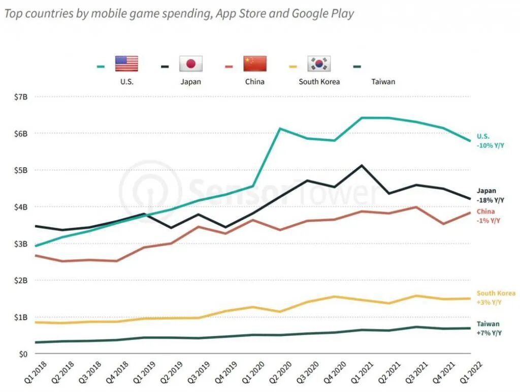 而在这当中,美国、日本等市场下滑的最为严重。Sensor Tower指出,在2021年期间,美国手游消费每个季度都超过60亿美元,但在2022年Q1期间,却出现了10%的同比下滑。而日本市场更是已经连续三个季度下滑,2022年Q1同比下滑了18%。
