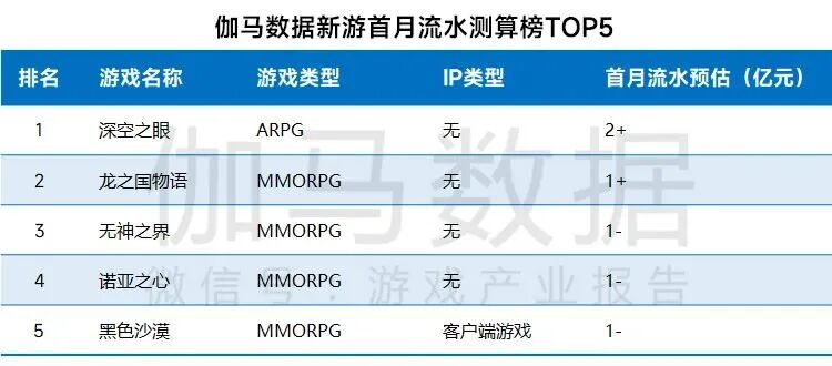 报告显示,4月新游首月流水测算Top5分别为《深空之眼》《龙之国物语》《无神之界》《诺亚之心》以及《黑色沙漠》。其中,《深空之眼》的首月预估流水达到了2亿元以上,《龙之国物语》的首月预估流水则为1亿元以上,剩余的3款游戏流水都在1亿元以下。