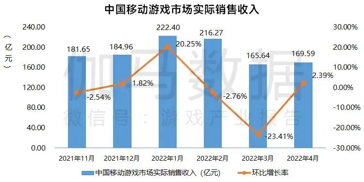 报告显示,2022年4月中国移动游戏市场实际销售收入169.59亿元,同比下滑5.29%,但环比方面仍然实现了增长,增幅为2.39%。