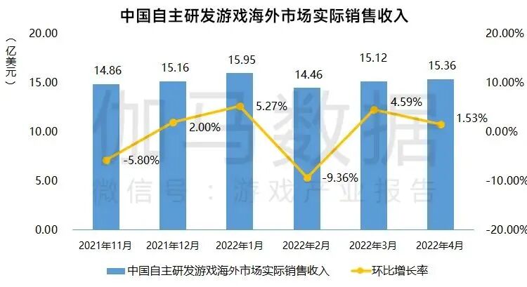 正因如此,近几年国内游戏在海外市场也取得了不错的成绩。报告显示,2022年4月,中国自主研发游戏海外市场实际销售收入为15.36亿美元,环比增长1.53%。
