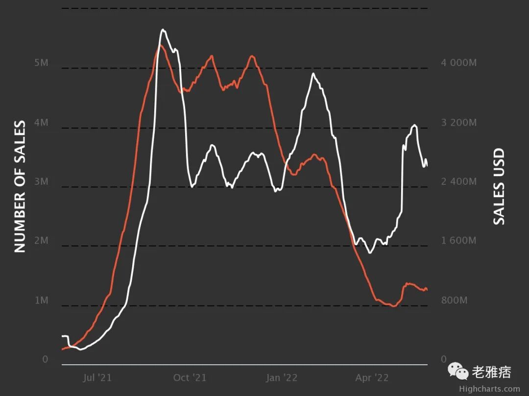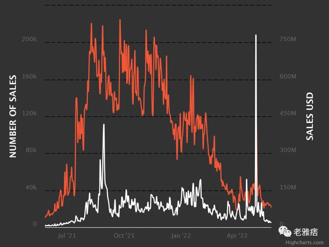 根据NonFungible的数据统计,NFT整体市场也在持续下降,尽管每家情况看起来有所不同,这取决于你如何切分。如果你看的是日平均数,全年的销售数量和金额都在下降(尽管在5月1日无聊猿游艇俱乐部背后的公司推出了一个名为Otherside的项目时出现了一个巨大的高峰)。从月平均数来看,销售量仍在下降,但销售的美元金额已经回升。