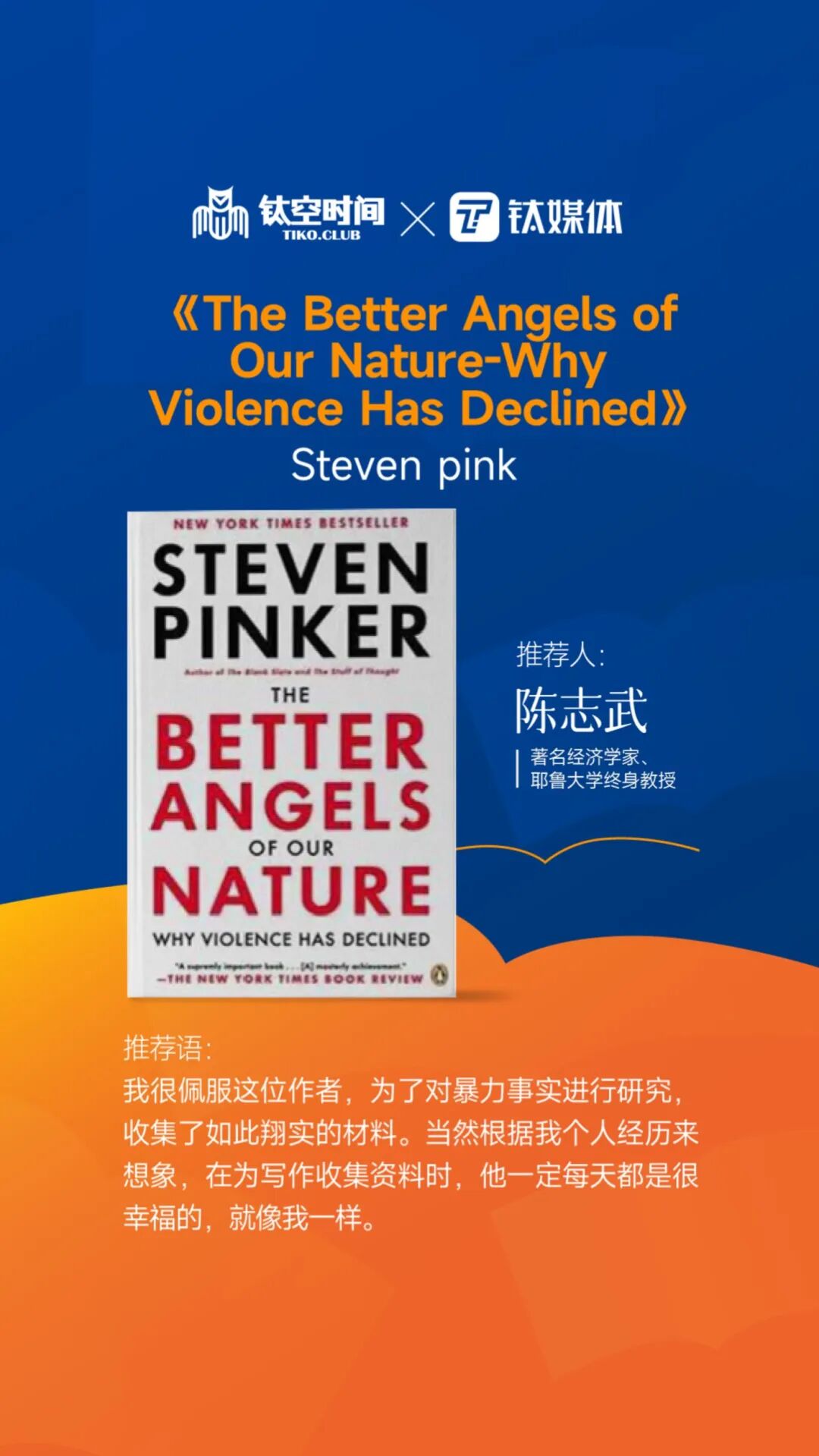¡¶The Better Angels of Our Nature-Why Violence Has Declined¡·£¨ÒëÃû£º¡¶ÈËÐÔÖеÄÉÆÁ¼Ììʹ¡·£©ÕâÊÇÒ»±¾ÈËÀàÐÄÀí½ø»¯Ê·£¬¿ª´´ÐÔµØÔËÓÃÁË×îÇ°ÑØµÄÐÄÖÇÀíÂÛÑо¿ÈËÀàÀúÊ·£¬ÒÔÕðº³ÈËÐĵķ½Ê½ÆÊÎö´Ù·¢±©Á¦µÄÈËÀàÐÄÀíµÄÄÚÍâÒòËØ¡£ÌÖÂÛÁ˱©Á¦£¬ÒÔ¼°ÎªÊ²Ã´ÔÚÎÒÃǵÄÀúÊ·ÖгÊÏÖÎȲ½Ï½µµÄÇ÷ÊÆ£¬ÒÔ¼°ÎÒÃǸÃÈçºÎʹÕâÇ÷ÊÆ¼ÌÐøÏÂÈ¥£¬Òýµ¼´ó¼ÒÓÃȫеĽǶȿ´ÈËÐÔ¡¢¿´ÀúÊ·¡¢¿´ÊÀ½ç£¬ÈÃÎÒÃÇÉî˼ÈËÀàÉç»áµÄδÀ´ÃüÔË£¬Èç¹ûÒßÇéÆÚ¼ä£¬ÄãÓÐʱ¼äÔĶÁÓ