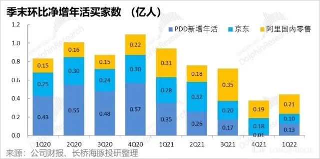 21 年四季度时,拼多多的活跃买家数增长停滞,app 季活用户甚至环比净减少 100 的 “鬼故事” 还历历在目。