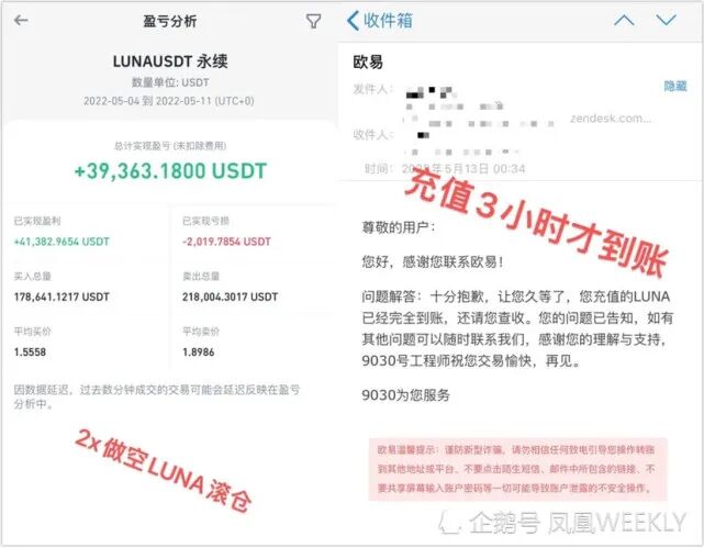 5月12日,他又发现币安和欧意两个交易所的Luna价格存在溢价,大约有十倍利润,便果断冲入币安购买Luna后提币到欧意交易所,希望挣这十倍的差价。可是链上的充值已经到位了,交易所的账户里却迟迟不显示充值到账。他在找朋友帮忙后苦苦等到了三个小时,才充值到交易所账户,但此时溢价已经消失。