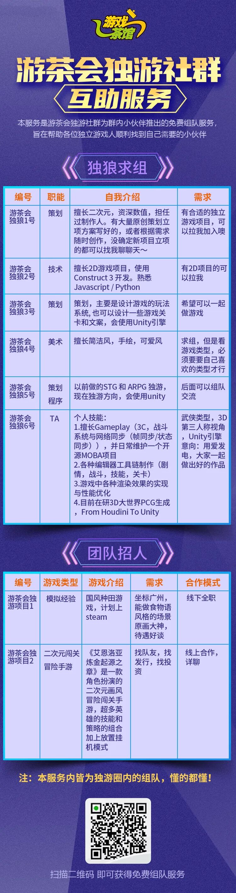 如果不管您是独狼(个人)求组队,或者您所在的独立游戏团队有招聘需求,甚至是您想做一款独游,想找志同道合的小伙伴用爱发电,都欢迎随时与我们联系。想了解更多信息,欢迎添加管理员微信咨询:lyz6432c