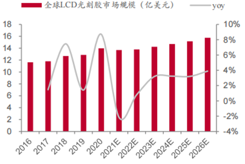 ▲2016-2026 全球 LCD 光刻胶市场规模(亿美元)