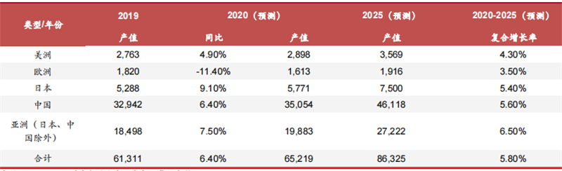从区域看,根据 Prismark 预测,未来全球各区域的 PCB 产业都将呈现较快发展状态。其中,2020 年中国地区预测同比增长 6.4%,2020 年至 2025 年中国地区复合增长速度预测将达到 5.6%。日本、亚洲(主要是我国台湾地区和韩国)是全球封装基板主要供应地,未来 5 年将呈现较高的增长速度。