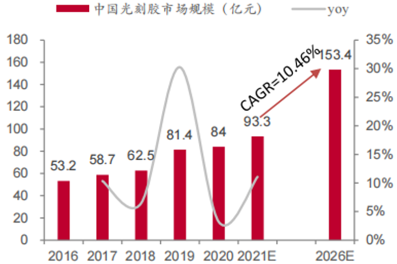 ▲2016-2021 中国光刻胶市场规模
