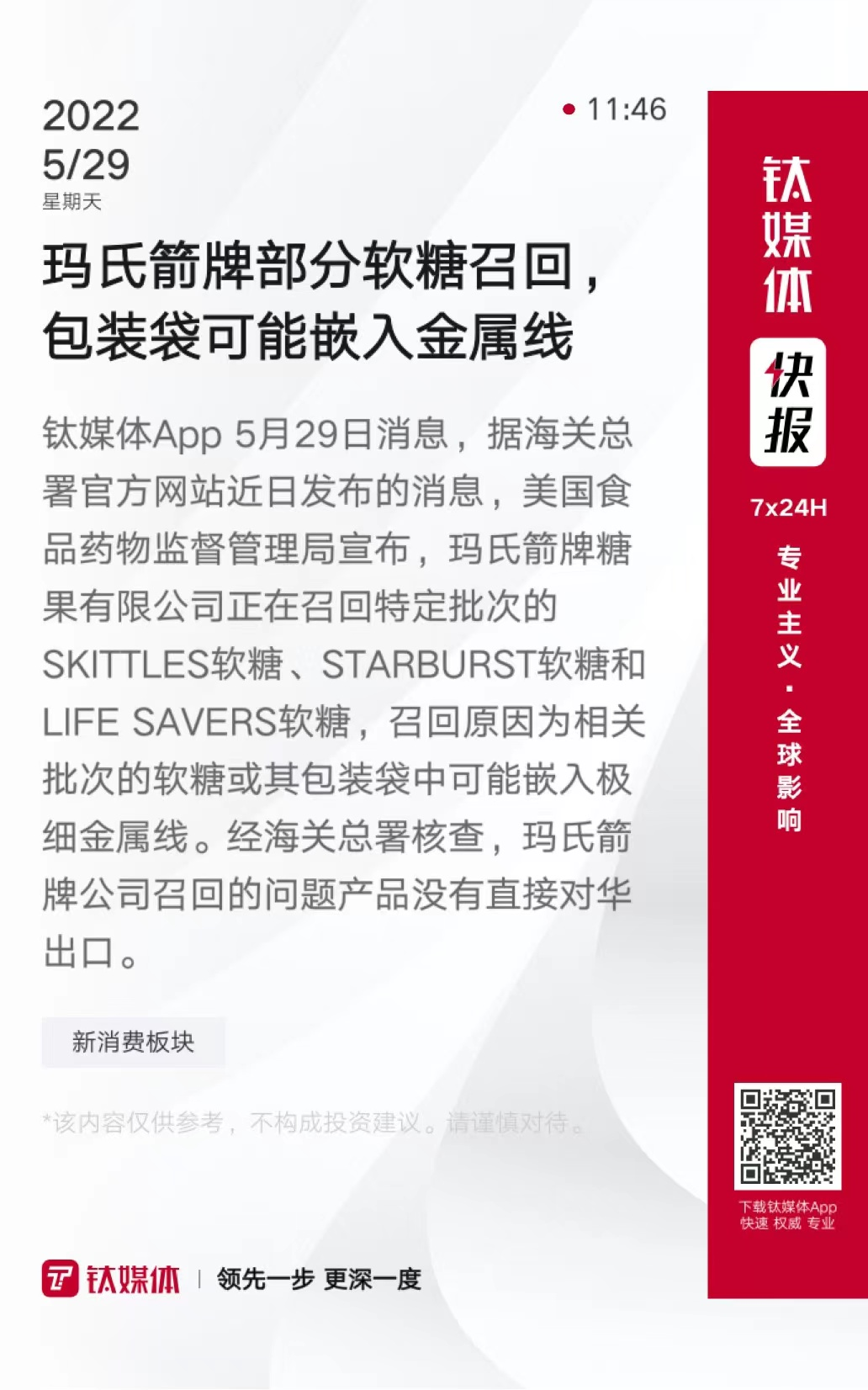 玛氏箭牌部分软糖召回,包装袋可能嵌入金属线
