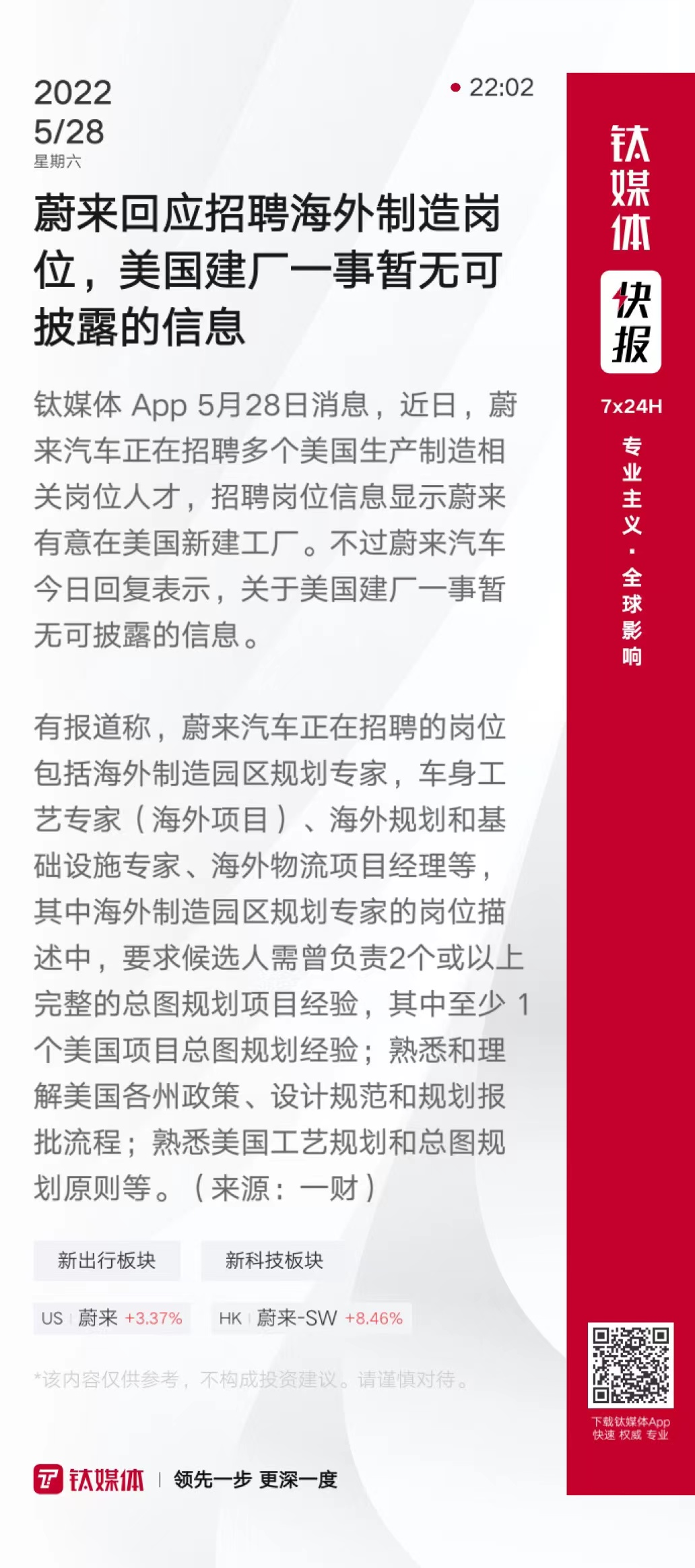 蔚来回应招聘海外制造岗位,美国建厂一事暂无可披露的信息