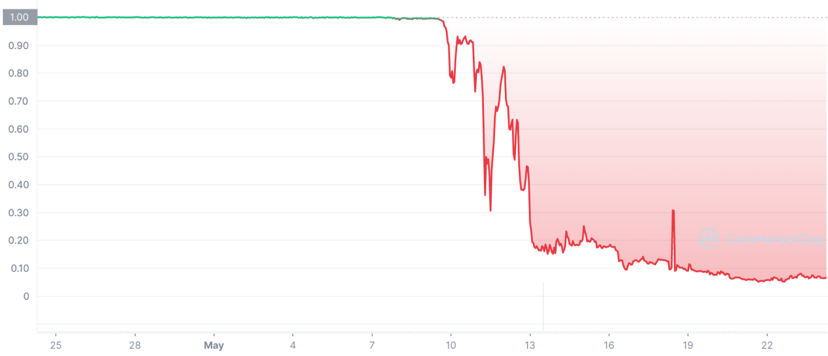 随着俄乌战局的稳定,加密货币刚从政治争端的泥沼中爬出来,5月份以来又开始跌入谷底。5月12日,加密货币遭遇了“黑色星期四”。据加密货币价格追踪网站Coinmarketcap统计,加密货币市值在一天之内蒸发2000亿美元,当天比特币最低曾跌至25401.29美元。美国《洛杉矶时报》网站称其为,“加密货币市场正出现自2020年市场反弹以来最严重的一场抛售行情。”此次加密货币的下跌,直接原因是“地球”美元稳定币UST的内爆。UST,即TerraUSD ,是Terra区块链推出的算法稳定币。稳定币能够被看成一种具有“锚定”属性的加密货币,即通过锚定主流货币来实现价值的稳定。为了维持UST的成长,Terra生态推出了LUNA,也被称为“月亮币”。UST通过LUNA币种实现锚定在一美元。在Terra生态系统中,LUNA能够和UST自由兑换,当UST价格高于一美元时,用户能够将UST换成LUNA,通过销毁UST以赚取高出一美元的差价,此时UST的供给下降,价格向着一美元趋紧。反之亦然。此前,UST的项目方为了增加其使用量,给予大量存款补贴,存UST的利息高达20%左右。随着官方给的高额利息补贴快用完了,投资就开始提前退出,导致UST遭到抛售。当UST价格低于一美元,大量持有UST的人纷纷换成LUNA以套现。而市场的挤兑情绪越演越烈,Terra区块链网络无法承载在短时间内销毁UST和铸币LUNA,导致该稳定币机制失效。从价格走势上看,在此次不可逆的价格脱锚事件前,UST的价格稳定在一美元,而自5月10号起,其价格应声下跌,目前多维持在0.06美元左右。从LUNA价格走势看,其在今年4月份曾经接近120美元,但目前已经几近归零。UST和LUNA暴跌的情绪很快搅动整个币圈,导致加密货币集体大跌。一方面,UST背后机构大量囤积过比特币。据悉,加密货币公司Terra为了支持其失败的稳定币,购买了价值超过30亿美元的比特币。而目前UST还没有显示出“生还”的迹象,该机构未来可能从比特币的大买家被迫变为大卖家。另一方面,信心有时比黄金重要,信心的丧失带来主流加密货币价格下降的连锁反应。作为稳定币本应是最为安全和稳定的加密货币,而此次的崩溃从侧面说明了加密货币在机制、算法上存在弱点,以及缺乏中心化监管机构的背书难以应对突发危机。