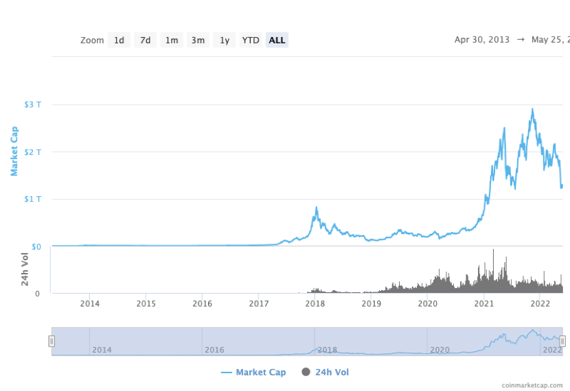 在过去的几年,加密货币风光无限,虽然市场上无时不充斥着对加密货币的质疑或唱衰,但这并不影响其整体市值的不断壮大,越来越多的主流机构也将其纳入投资资产范畴。据Statista统计,2022年2月,加密货币共有10397种,而这一数值在2021年2月份只有4501种,同比增长了230%。据Coinmarketcap统计,在 2021年11月份,加密货币的市值曾逼近3万亿美元。年初至今,主流加密货币均遭遇大规模下跌。除了稳定币,市值排名较前的货币跌幅多位于40%-60%区间。加密货币整体市值目前接近1.29万亿美元,相较去年最高点跌去超54%。