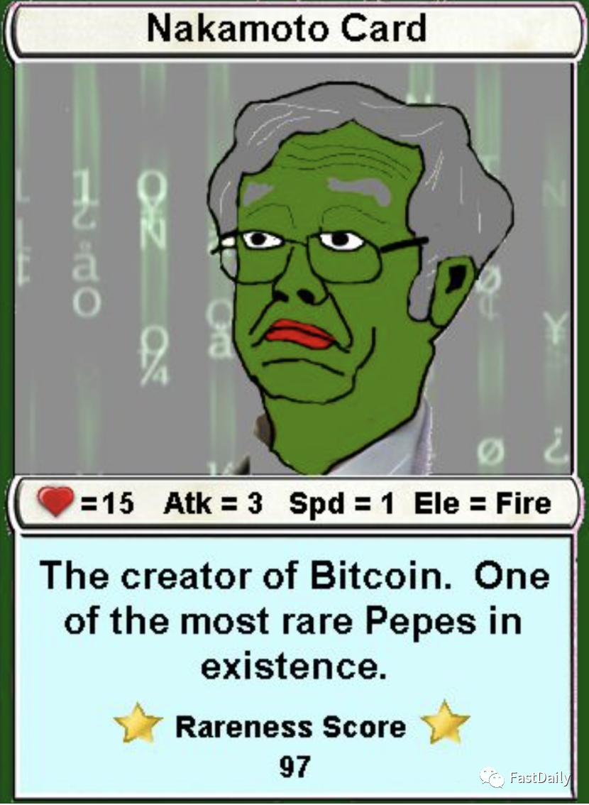 转载请微信联系:huangdiezi,更多DAO、Web3、NFT、Metaverse资讯请关注老雅痞Rare Pepes(稀有佩佩)是已知最早基于区块链的数字艺术收藏品之一。NFTs并不是从以太坊开始的,它们始于比特币,或者说始于比特币区块链的一个分叉,即Namecoin。在2014年,人们公认,艺术家Kevin McCoy在纽约发行的量子(Quantum)是第一个NFT。正如早期的比特币采用者Joe Looney所说的那样,尽管如此,作为数字艺术的NFT直到2015年才真正成为一种事物,当时一家位于瑞士的小型独立游戏公司EverdreamSoft发布了一款游戏,其代币看起来几乎像数字魔术集锦卡。这些收藏品通过比特币协议Counterparty制作,该协议允许用户轻松创建和交换数字代币,这些收藏品以《龙与地下城》风格的图像为特色,但也有对加密货币世界的暗示(例如,一个不露面的巫师代表比特币的匿名创建者中本聪)。Looney回忆说,它们为比特币区块链上更多非严格意义上的货币资产的创造而搭建了舞台。住在新泽西的机械工程师Looney被比特币和Counterparty协议所吸引。作为一种爱好,他建立了一个钱包,用于购买和出售建立在Counterparty上的资产,包括创世卡。与此同时,其他一小部分早期采用者已经开始在协议上创建自己的代币。有一天,这个小组的一名成员在Counterparty小组聊天中发布了一种不同的卡片。这是对流行人物 "青蛙佩佩"(Pepe the Frog)的一个模仿。"青蛙佩佩 "是一位名叫Matt Furie的艺术家在他2006年的 "男孩俱乐部 "漫画中创作。到2015年,佩佩的产生影响已经远远超出了Matt Furie的漫画,侵入了从Reddit到4chan的几乎所有互联网meme制造角落。2016年前后,它还会因为被反右派采用而获得大量主流媒体的关注,然而,在此之前,似乎所有互联网社区的成员都在使用这只青蛙作为表情包,包括加密货币社区。(2020年一部关于Furie的纪录片《Feels Good Man》,后来通过探索这个meme的起源和广泛影响,帮助将Pepe从其更邪恶的关联中解放出来)。出现在Counterparty群组聊天中的特定版本佩佩,是一个加密佩佩。它以交易卡的形式,展示了现实生活中的中本聪的肖像,有一张绿色的、类似佩佩的脸。迈克的卡片是对该meme在各种加密货币聊天中的使用一种俏皮致敬,在那里,人们将该图像改编成各种形式的加密货币表情包。这是后来1,774张稀有佩佩卡系列中的第一张,是已知最早的基于区块链代币集合,严格意义上作为数字艺术使用。Looney重塑了他的普通Counterparty钱包,使其成为佩佩的主题,随着越来越多的人开始创造稀有佩佩,他们开始使用钱包来交易它们,许多人至今仍在使用。
