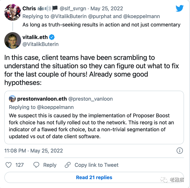 该推特线程最终引起了以太坊的一些核心开发者的注意。以太坊创始人Vitalik Buterin本人也加入进来,为一种理论增加了一些分量,即问题是由矿工运行过时的采矿软件版本造成的。