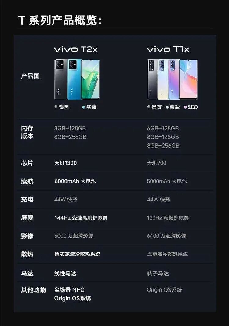 虽然距离发布还有一周的时间,但vivo新机vivo T2x却提前于发布会悄然上架,并将于5月31日10点开始预售。vivo T2x搭载联发科天玑1300处理器,电池容量高达6000mAh,支持44W快充。规格方面,vivo T2x重202.8g,厚9.21mm,提供镜黑、雾蓝两种配色选择。屏幕方面,vivo T2x采用一块6.58英寸水滴屏,支持144Hz变速高刷,支持全局DC调光,峰值亮度可达650nit。其他方面,vivo T2x后置5000万像素摄像头,前置1600万摄像头。同时还支持线性马达、全场景NFC、预留3.5mm耳机孔、侧面指纹识别,支持Hi-Res音质认证,拥有透芯凉液冷散热系统,基于 Android 12.0 开发的 OriginOS 2.0系统运行。价格方面,vivo T2x共提供两个版本,其中8GB+128GB售价为1599元、8GB+256GB售价为1799元。此外,官方还给出了vivo T2x与上一代T1x的对比图,从图片可以看出vivo T2x在芯片,续航,屏幕,散热等多方面都进行了升级。结合定价和配置,新机将是一款性价比较高的千元机型。目前vivo T2系列还只是发布了vivo T2x一款机型,另一款机型vivo T2还要等6月6日的发布会公布。据官方此前预热,vivo T2将搭载骁龙870处理器,支持UFS3.1,官方跑分 77万+ ;支持80W双芯低温闪充,15分钟补电60%;后置6400万像素摄像头。从配置定位看其定价应略高于vivo T2x,对vivo T2感兴趣的朋友可以关注后续消息。![]()