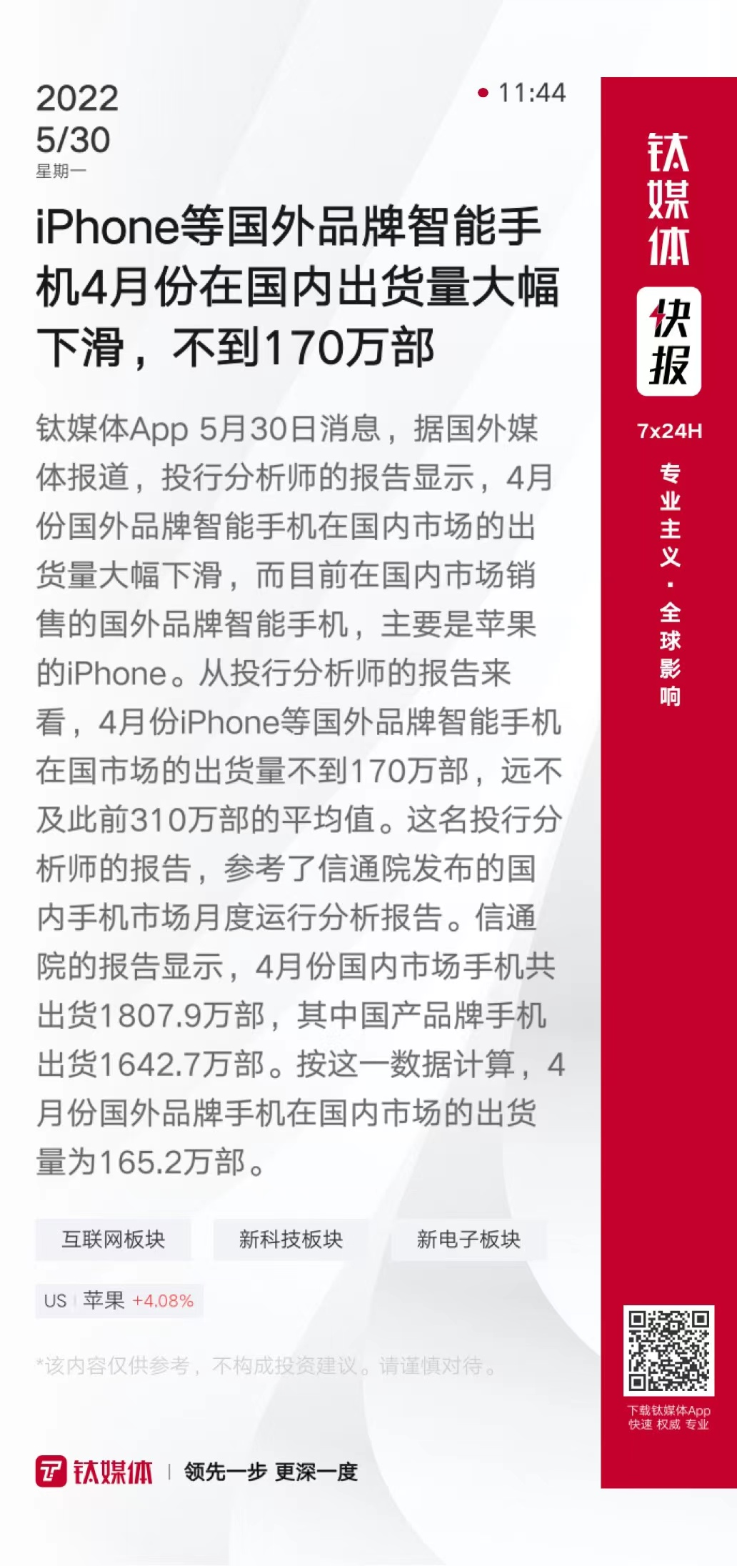 iPhone等国外品牌智能手机4月份在国内出货量大幅下滑,不到170万部