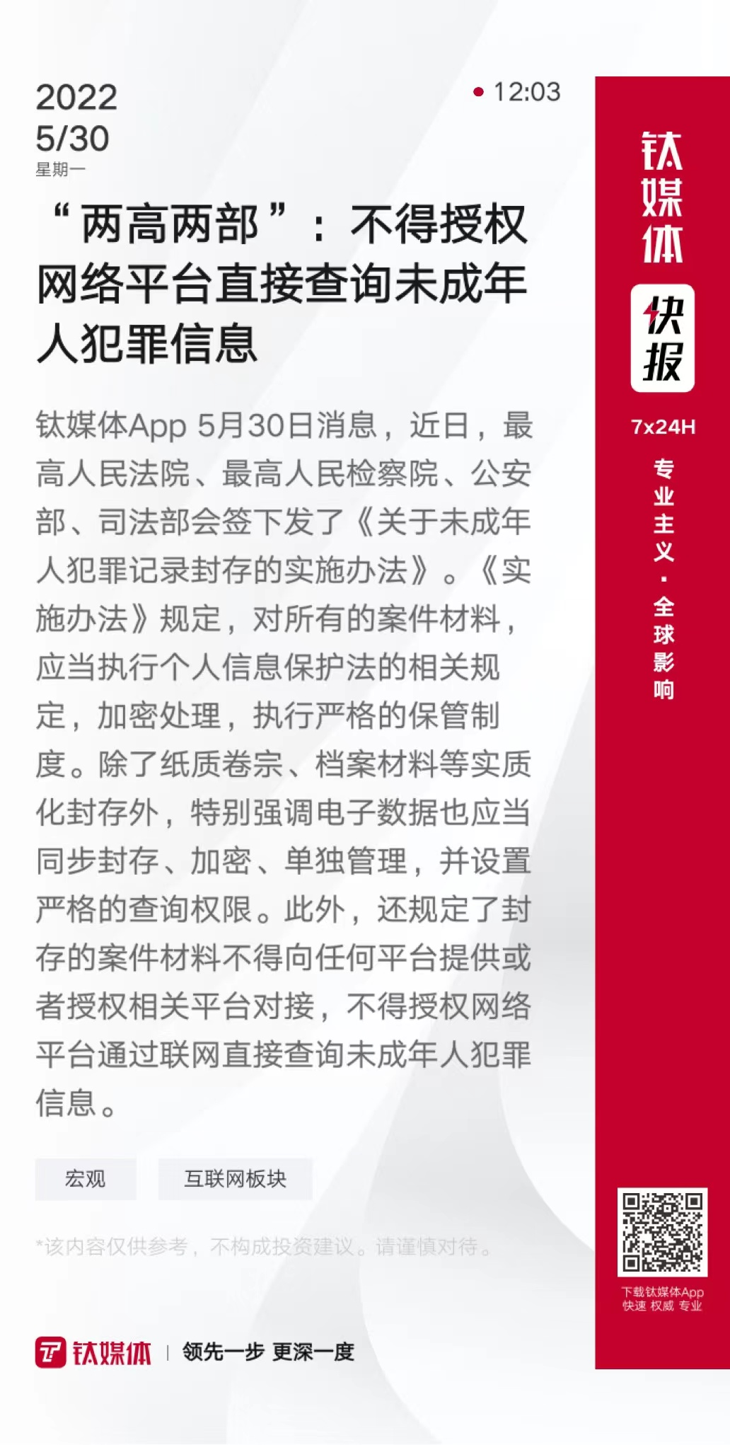 “两高两部”:不得授权网络平台直接查询未成年人犯罪信息