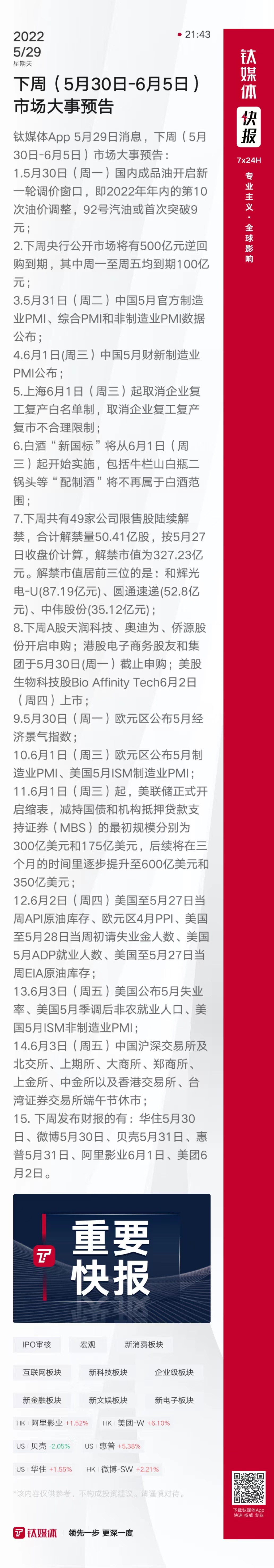 本周(5月30日-6月5日)市场大事预告