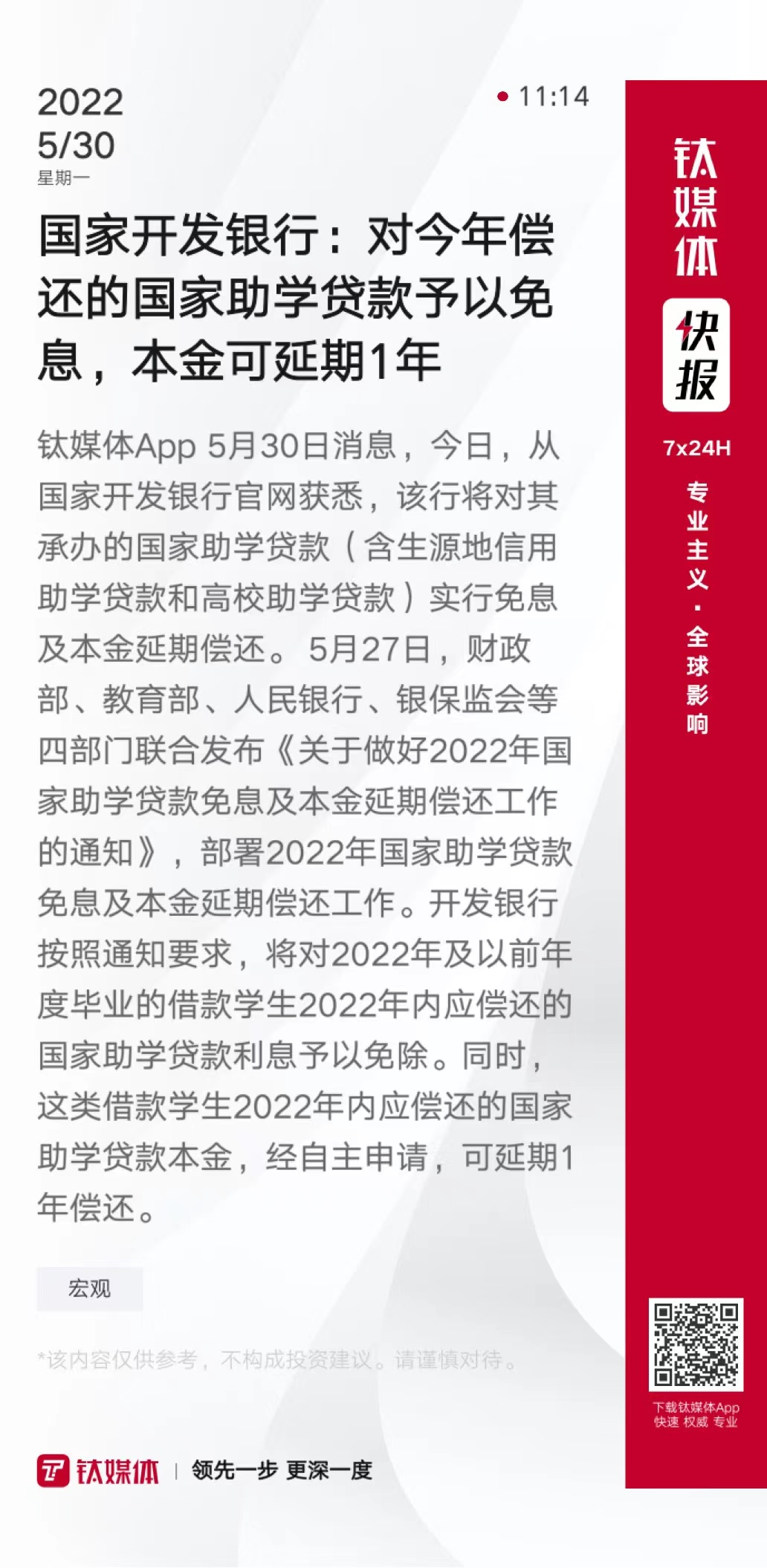 国家开发银行:对今年偿还的国家助学贷款予以免息,本金可延期1年