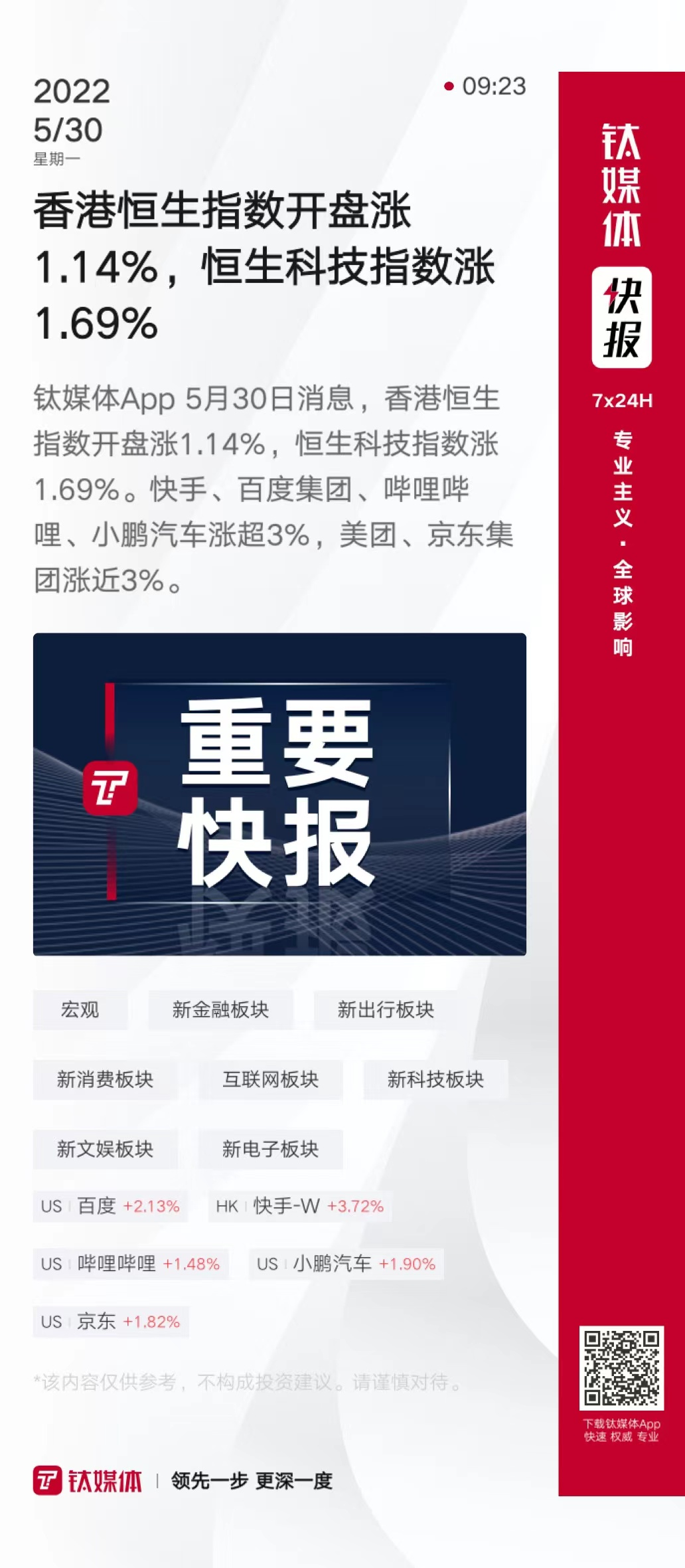香港恒生指数开盘涨1.14%,恒生科技指数涨1.69%