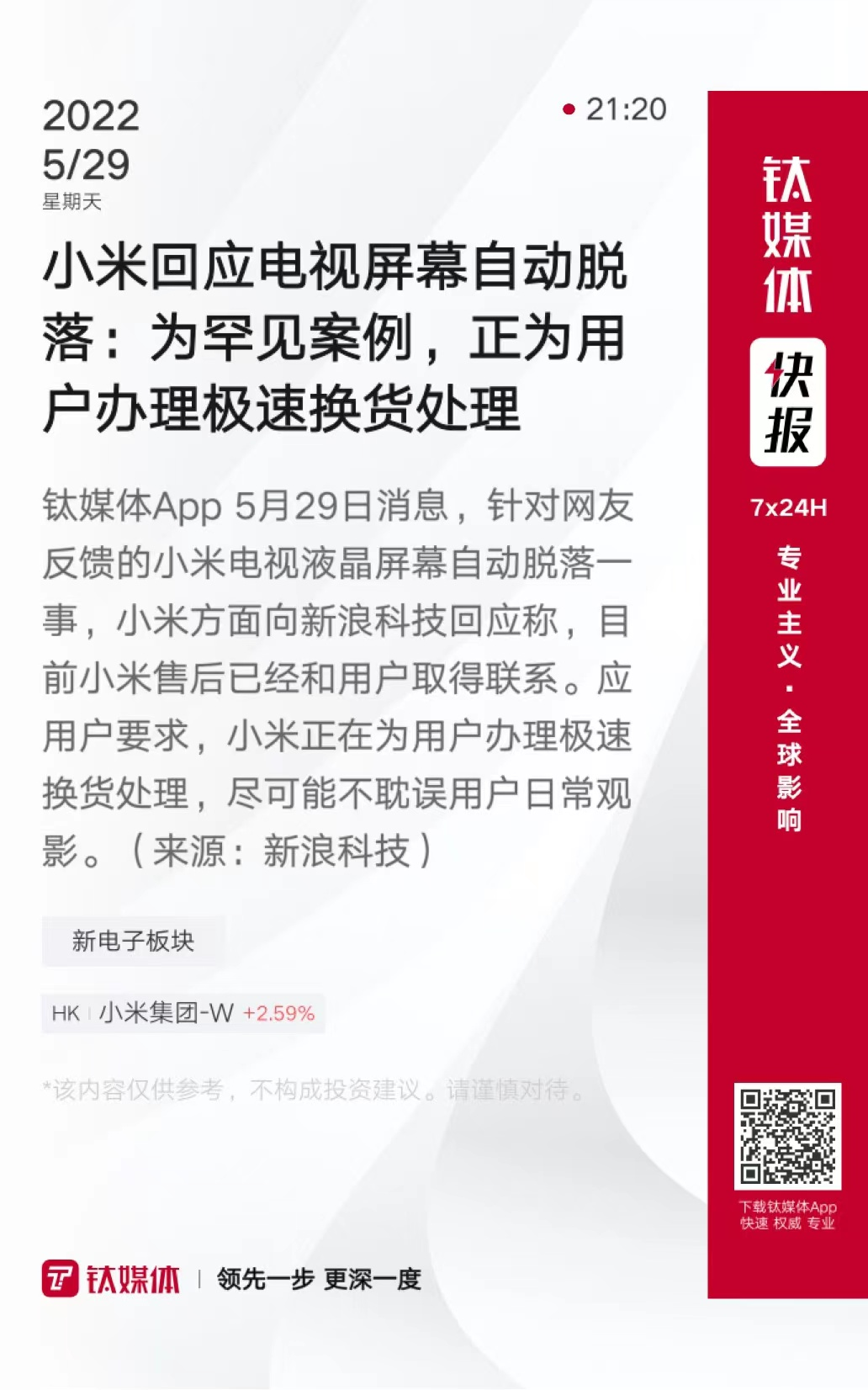 小米回应电视屏幕自动脱落:为罕见案例,正为用户办理极速换货处理