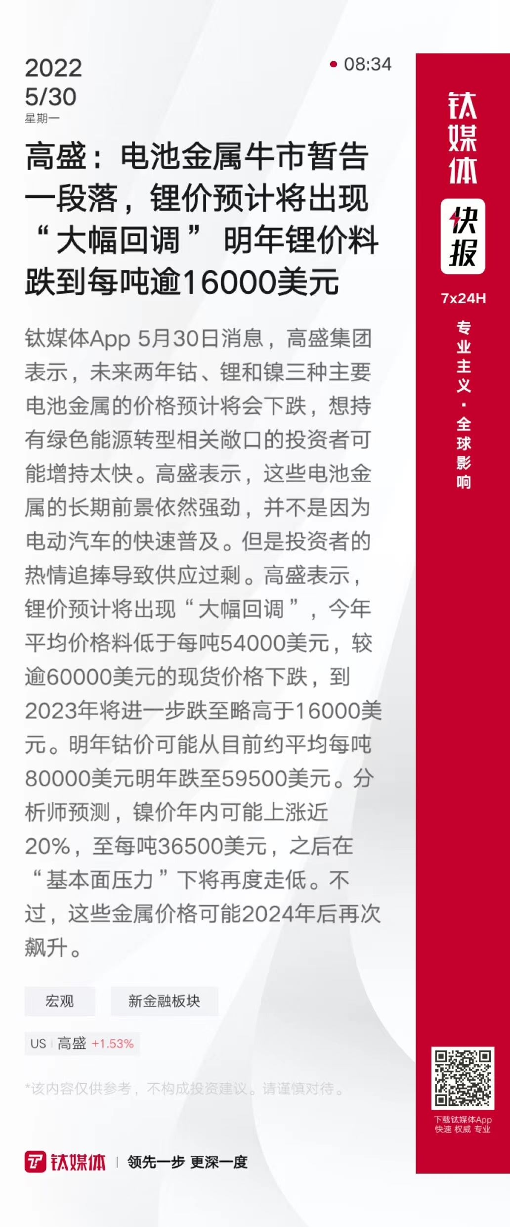 高盛:电池金属牛市暂告一段落,锂价预计将出现“大幅回调” 明年锂价料跌到每吨逾16000美元