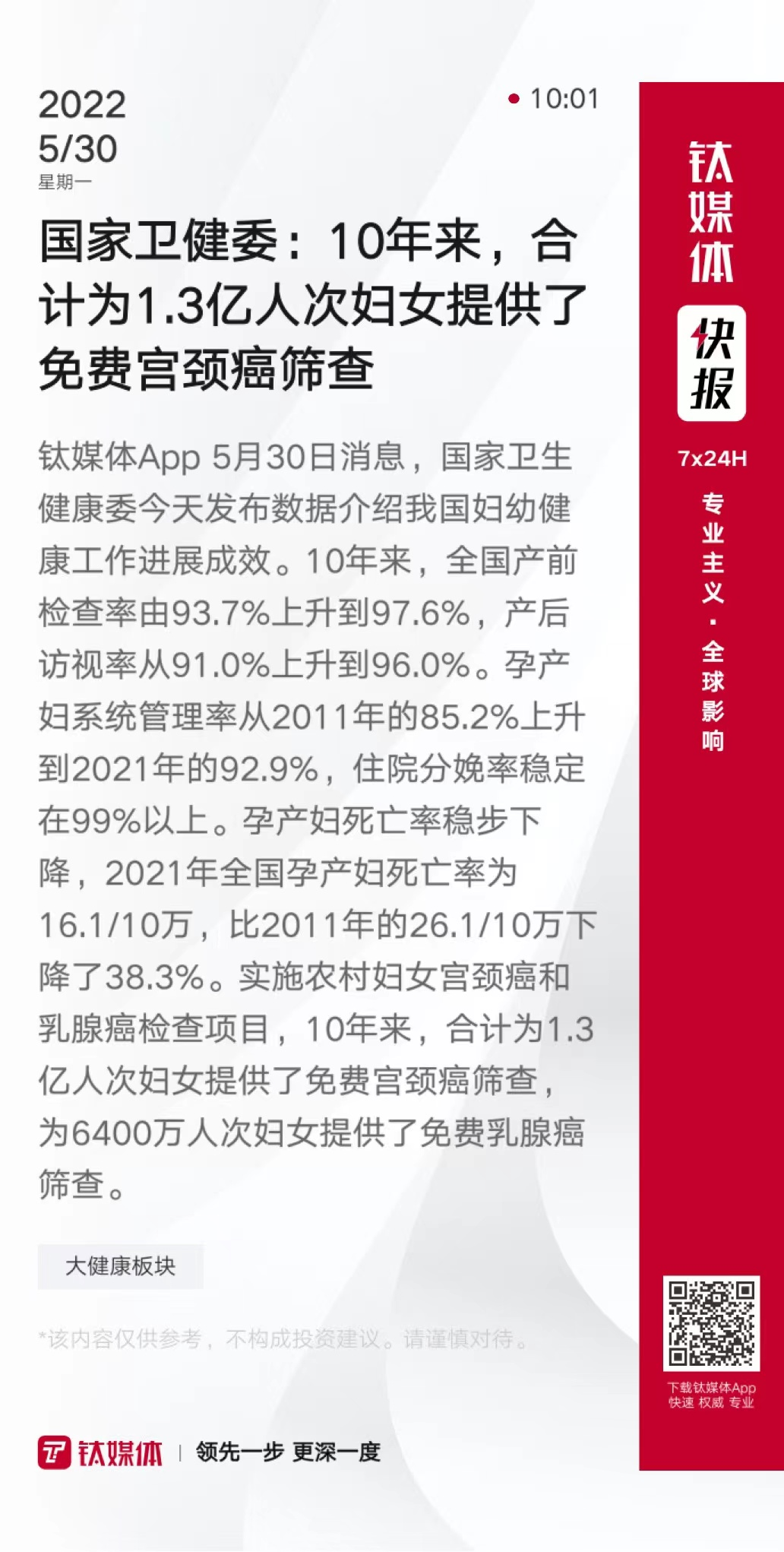 国家卫健委:10年来,合计为1.3亿人次妇女提供了免费宫颈癌筛查