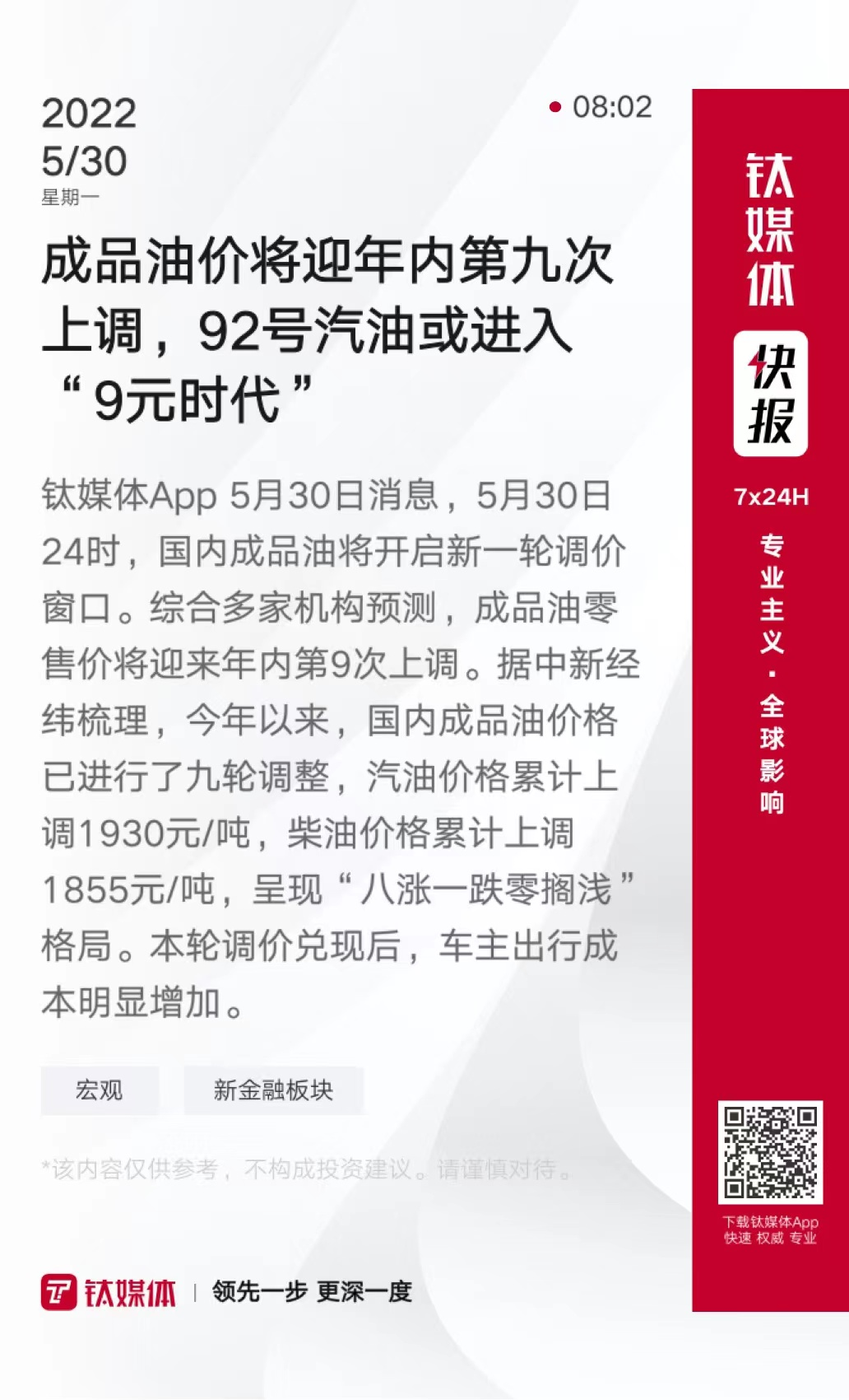 成品油价将迎年内第九次上调,92号汽油或进入“9元时代”
