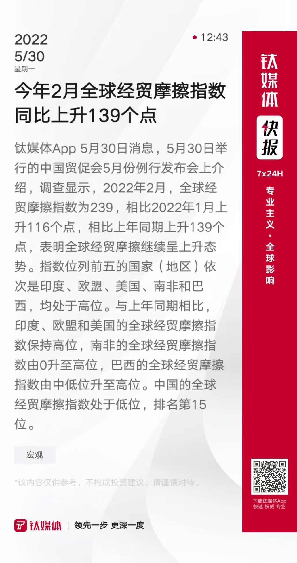 今年2月全球经贸摩擦指数同比上升139个点
