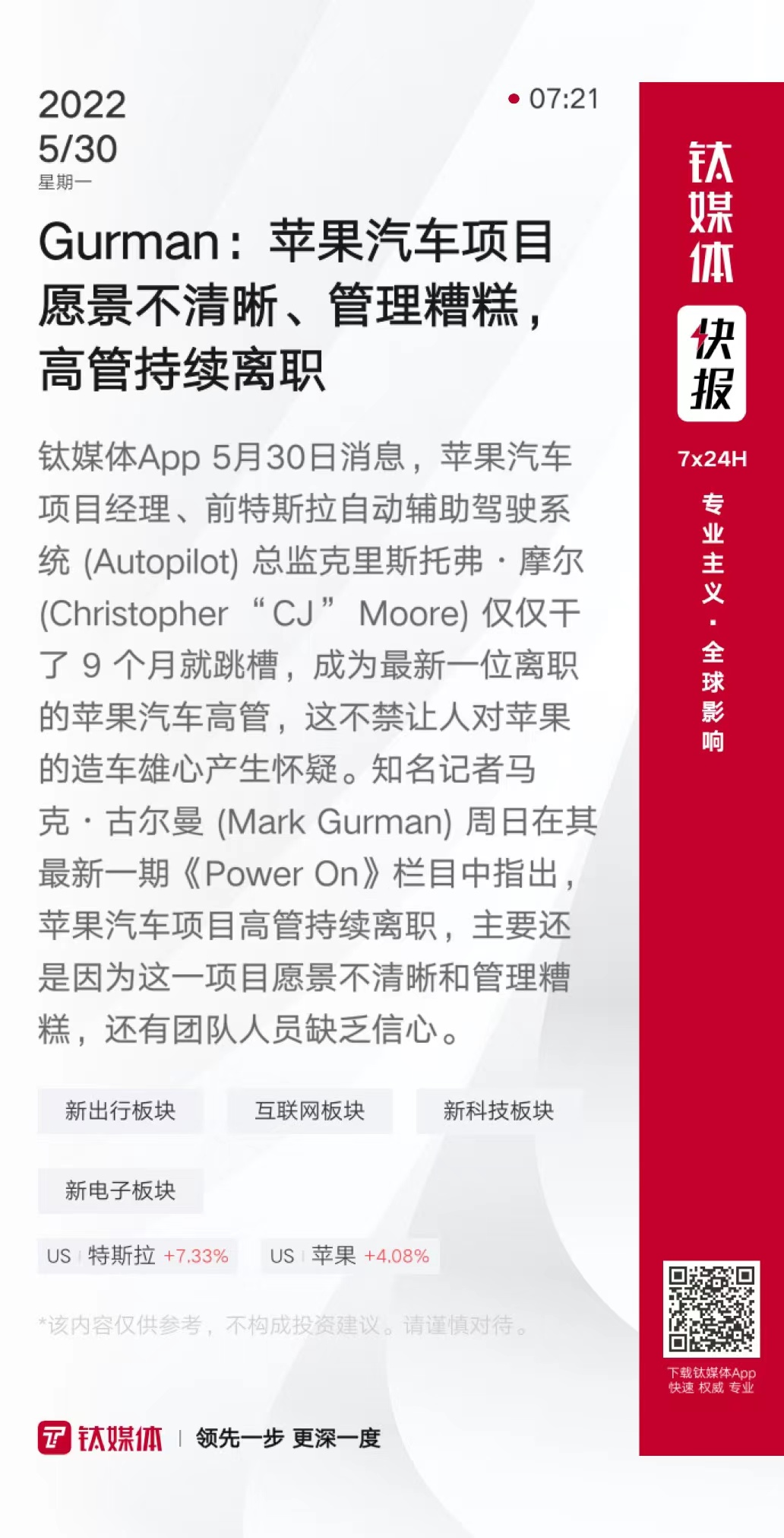 Gurman:苹果汽车项目愿景不清晰、管理糟糕,高管持续离职