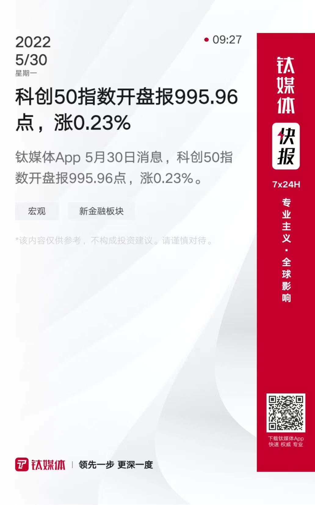 科创50指数开盘报995.96点,涨0.23%