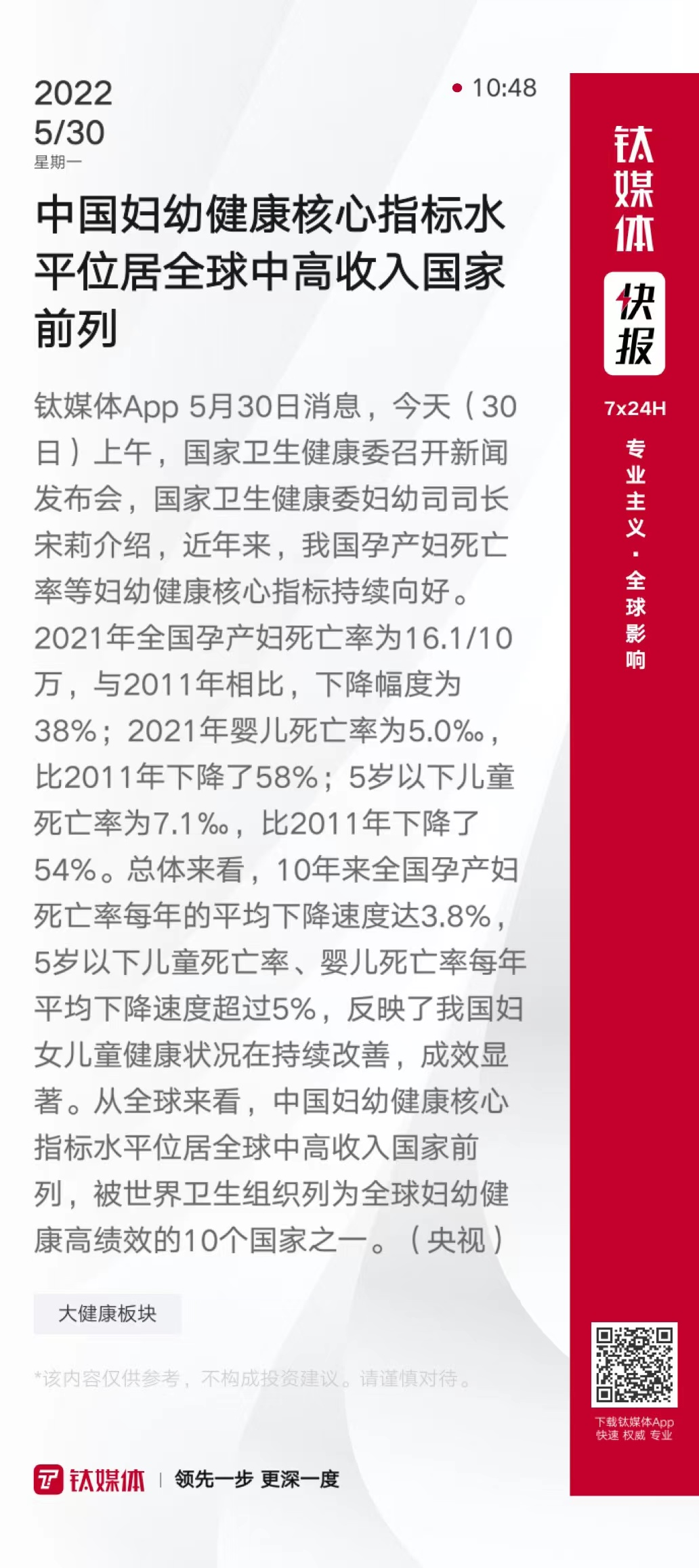中国妇幼健康核心指标水平位居全球中高收入国家前列