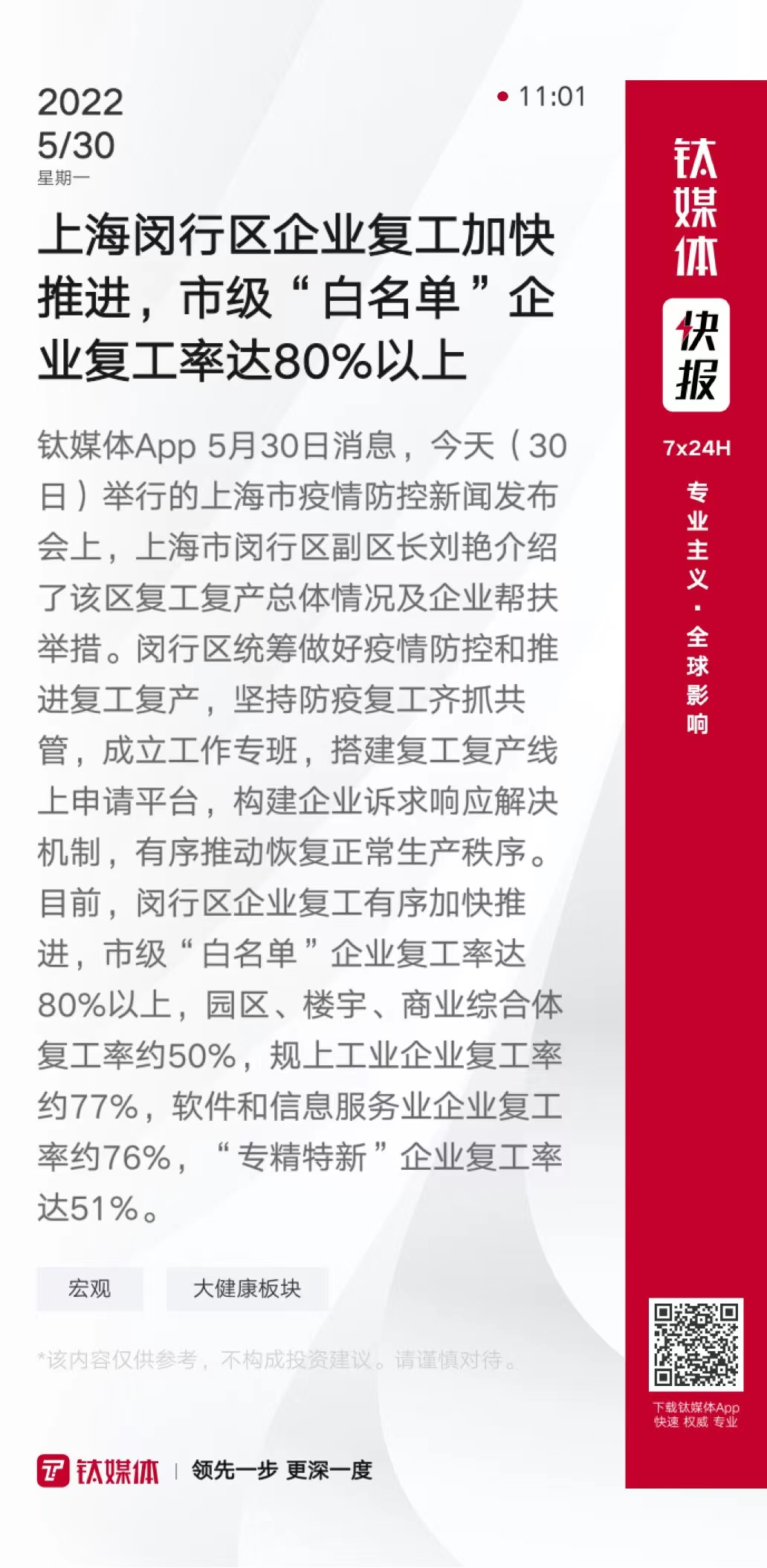 上海闵行区企业复工加快推进,市级“白名单”企业复工率达80%以上