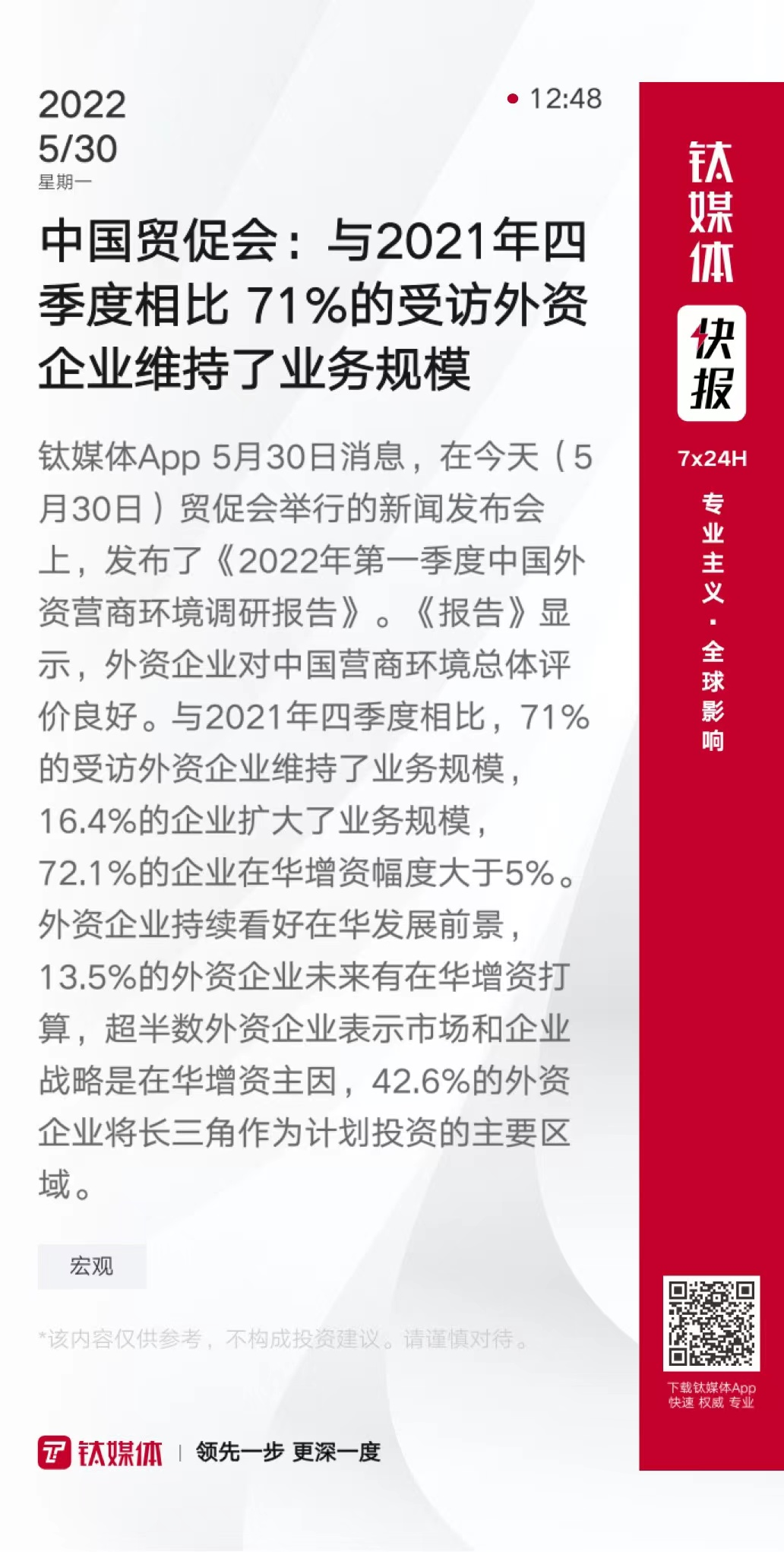 中国贸促会:与2021年四季度相比 71%的受访外资企业维持了业务规模