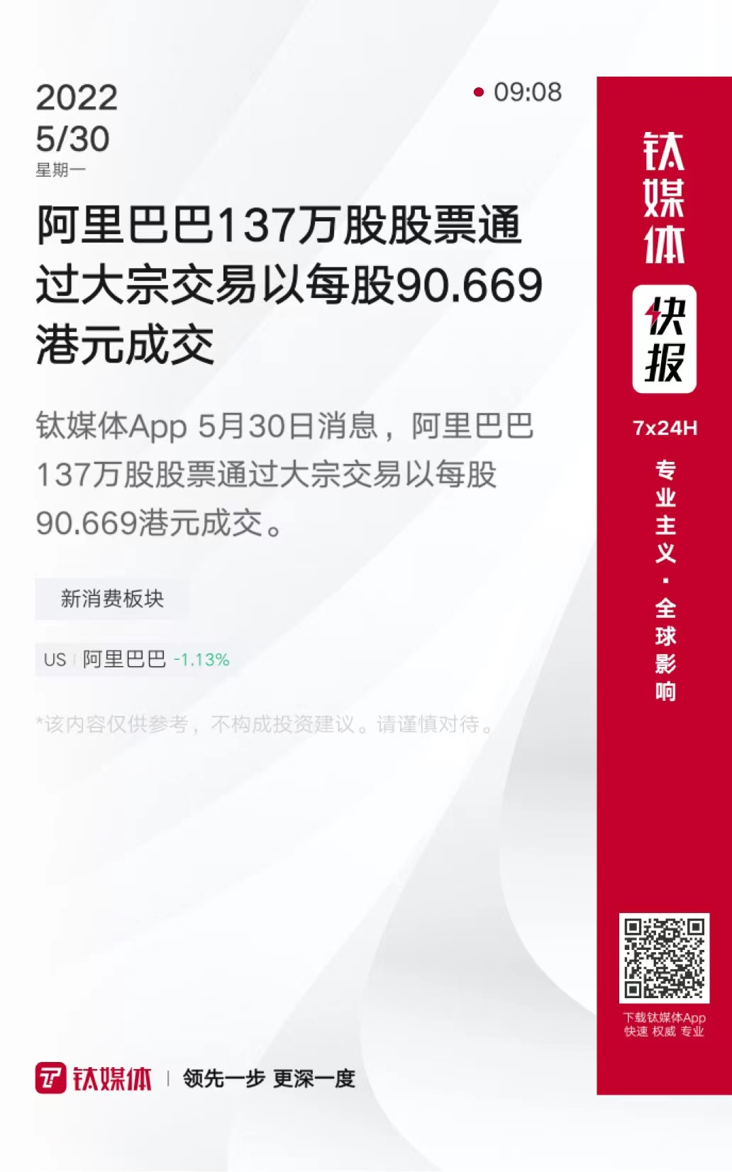 阿里巴巴137万股股票通过大宗交易以每股90.669港元成交