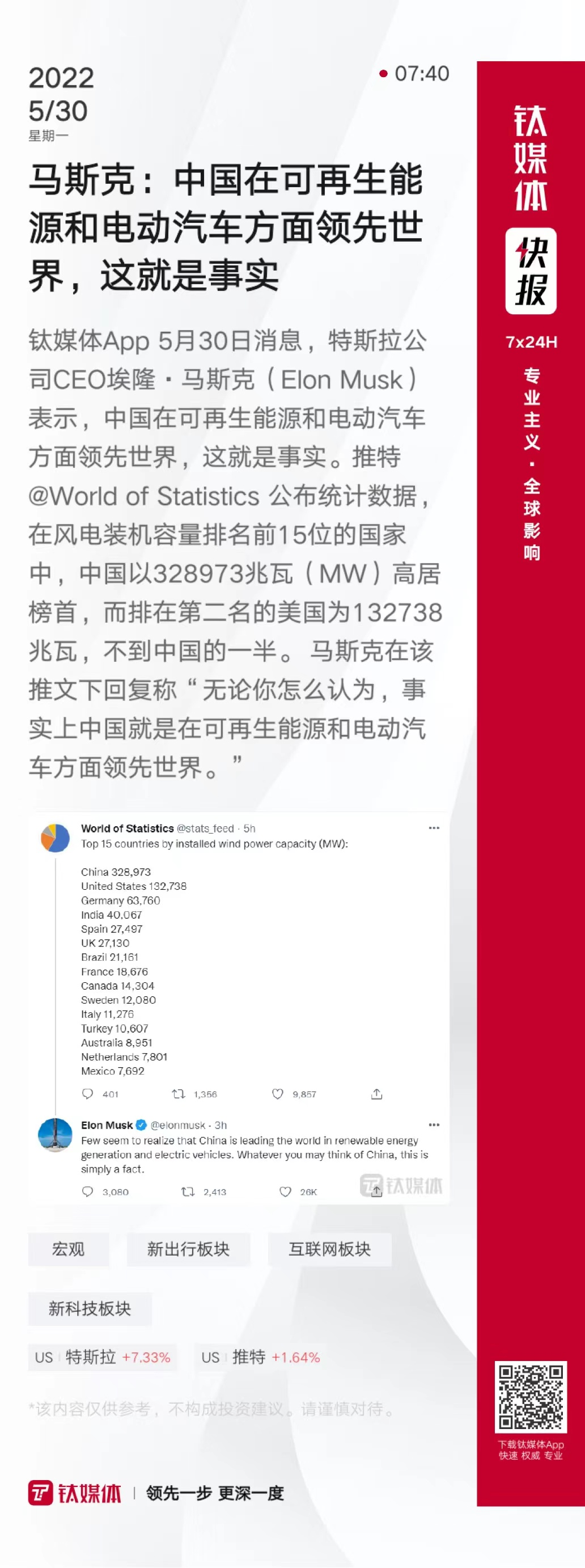 马斯克:中国在可再生能源和电动汽车方面领先世界,这就是事实