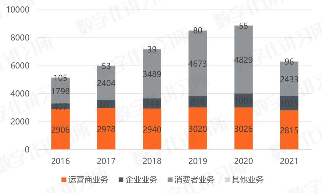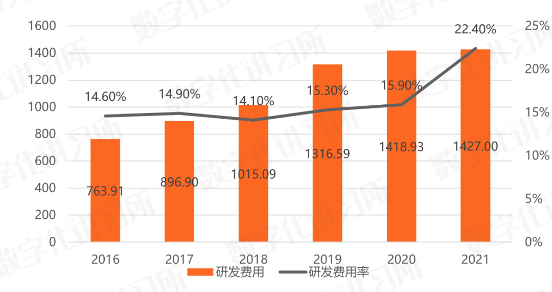 2021年,华为实现营业收入6368.07亿元,同比下降28.6%;净利润为1137.18亿元,同比增长75.9%。手机业务受到谷歌GMS禁令和芯片供应影响导致消费者业务收入下降,进一步影响了营业收入的下滑。净利润的增加主要由于出售部分业务的收益、经营质量的改善和产品结构的优化。2019年至2021年,华为营业收入分别为8588.33亿元、8913.68亿元及6368.07亿元,净利润分别为626.56亿元、646.49亿元及1137.18亿元,营业收入有一定程度下降,但净利润大幅提高。图1:2019年至2021年华为营收净利润(亿元)数据来源:华为2021年报、数字化讲习所、零壹智库分业务来看,在运营商业务领域,2021年华为实现销售收入2815亿元,同比减少7%。公司累计签署了3000多个5G行业应用商用合同,推动5G在制造、矿山、钢铁、港口、医疗等行业规模商用。在消费者业务领域,华为实现销售收入2434亿元,同比下降50%,但智能穿戴、智慧屏、TWS耳机及消费者云服务均实现持续增长,其中可穿戴设备和智慧屏业务收入同比增长超过30%。搭载HarmonyOS的华为设备超过2.2亿台,成为全球发展速度最快的移动终端操作系统;在企业业务领域,华为取得快速增长,实现销售收入1024亿元,同比增加2%。2021年,面向政府、交通、金融、能源以及制造等重点行业,华为发布了11大场景化解决方案,成立了煤矿、智慧公路、海关和港口等军团,整合资源高效服务客户。全球700多个城市、267家世界500强选择华为开展数字化转型,服务与运营伙伴数量增长到6000多家。图2:2016至2021年华为分板块营收情况(亿元)数据来源:华为2021年报、数字化讲习所、零壹智库2.成本侧:研发费用额和费用率均居于近十年最高位