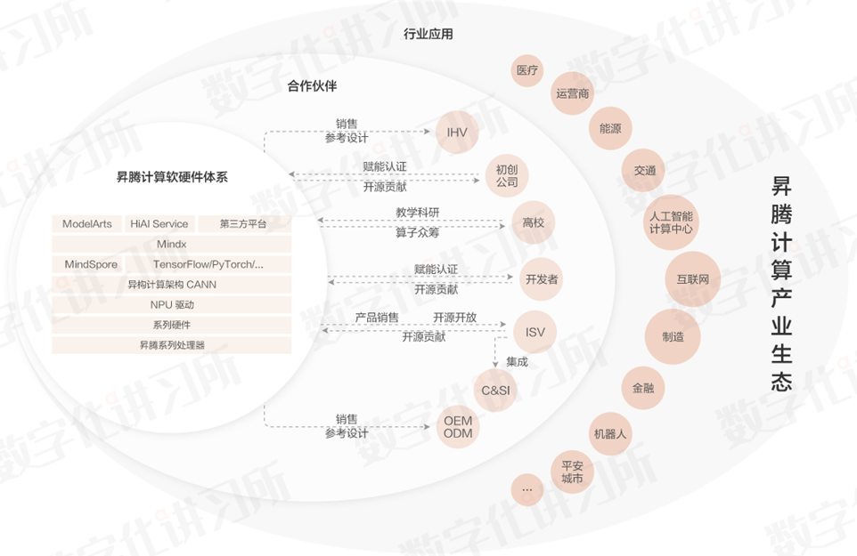 昇腾计算的基础软硬件是产业的核心,也是 AI 计算能力的来源。昇腾计算软硬件包括硬件系统、基础软件和应用使能等。昇腾计算的硬件系统包括:基于华为达芬奇内核的昇腾系列处理器等多样化 AI 算力以及基于昇腾处理器的系列硬件产品;昇腾计算基础软件体系包括:异构计算架构CANN 以及对应的各种运维管理工具和AI计算框架;昇腾应用使能 MindX,可以支持上层的 ModelArts 和 HiAI 等应用使能服务,同时也可以支持第三方平台提供应用使能服务。目前,在硬件开放方面,昇腾AI已经与超过20个硬件合作伙伴共同打造了端边云的全场景人工智能算力;在软件开源方面,昇思MindSPore支持原生大模型开发,已经开始赋能千行百业的众多应用场景。2.昇腾AI生态合作伙伴