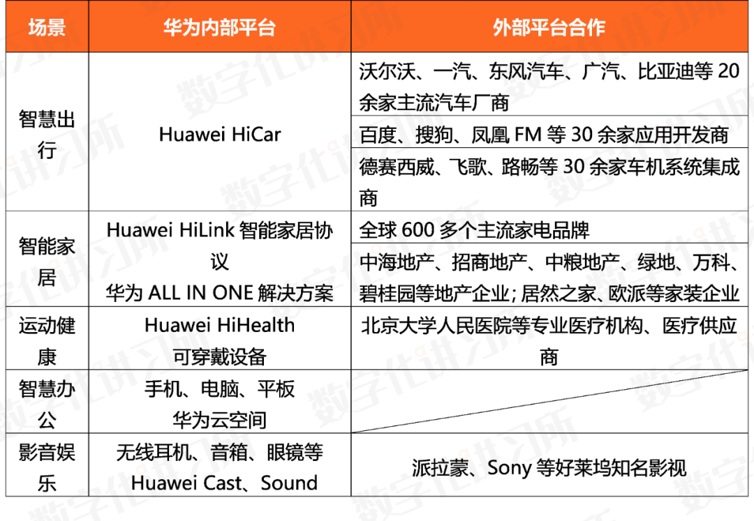 华为HarmonyOS2.0是一个面向物联网时代的操作系统,围绕智慧出行、智能家居、运动健康、智慧办公以及影音娱乐五大场景,提出“1+8+N 智慧生活战略”。其中“1”指的是智能手机这一入口,“8”为华为PC、平板、HD大屏、音响、手表、车机、AR眼镜、耳机,“N”则是其它硬件厂商参与的泛IoT硬件生态。通过HarmonyOS、HMS、智慧助手小艺、HiLink等赋能生态,实现极简交互、卡片协同,手机触碰即可完成智能设备联网,无需安装APP也能及时控制,有效提高智能设备使用效率。表1:华为鸿蒙生态五大应用场景内外部平台合作情况(不完全统计)2.三大技术优势