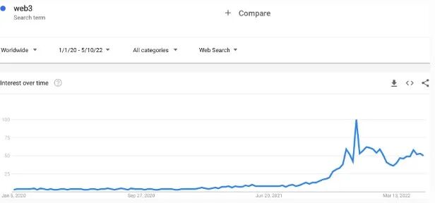 除了数量上的水涨船高——就如同元宇宙的概念在人们生活中越来越常见一般——人们对于Web3的关注也在逐步加深,根据谷歌趋势数据,从今年开始索Web3的数量也在一直上升。