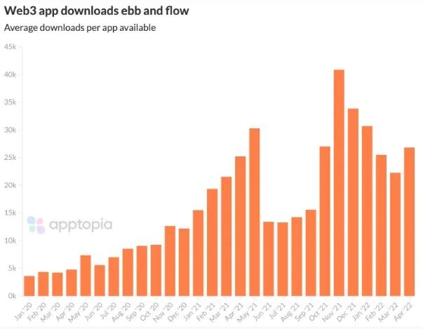 其实自2020年开始,自称为“Web3.0”的应用就已经出现,并在2022年呈现出了显著的上升趋势,根据数据研究机构Apptopia近期的报告,2022年可供下载的Web3应用程序数量的增长速度几乎是2021年的5倍。年初至今,可供下载的应用程序增长了88%。