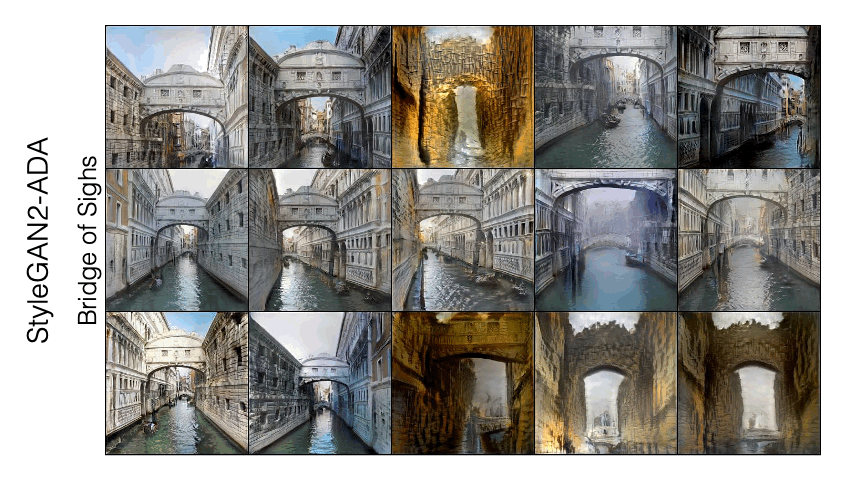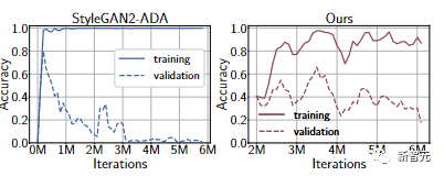 通过在FFHQ 1k数据集上的实验来看,即使采用最新的可微分数据增强方法,判别器仍然会过拟合,训练集性能很强,但在验证集上表现得很差。